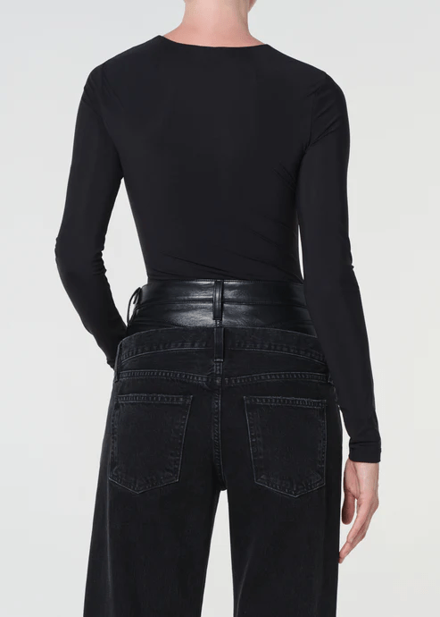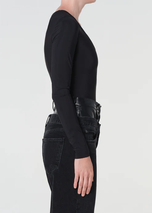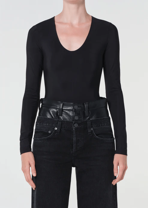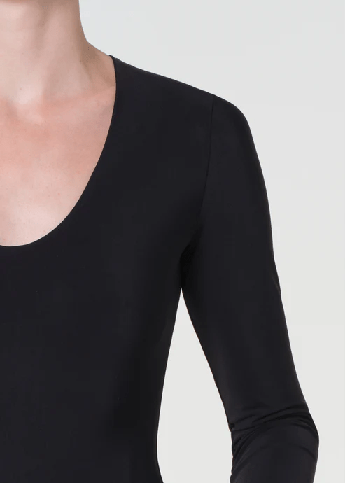 A long-sleeve scoop neck bodysuit in a lightweight, second-skin elastane blend. True to size, it offers a smooth, ultra-clean fit that layers effortlessly or stands alone. In black, it’s a minimalist essential with a modern, sleek edge.