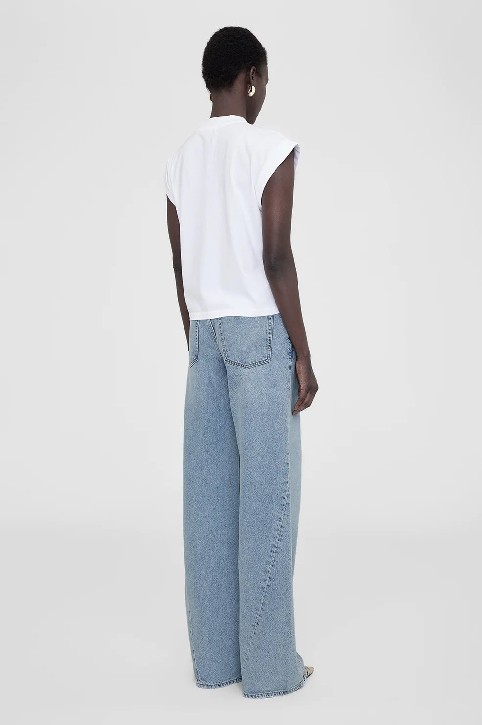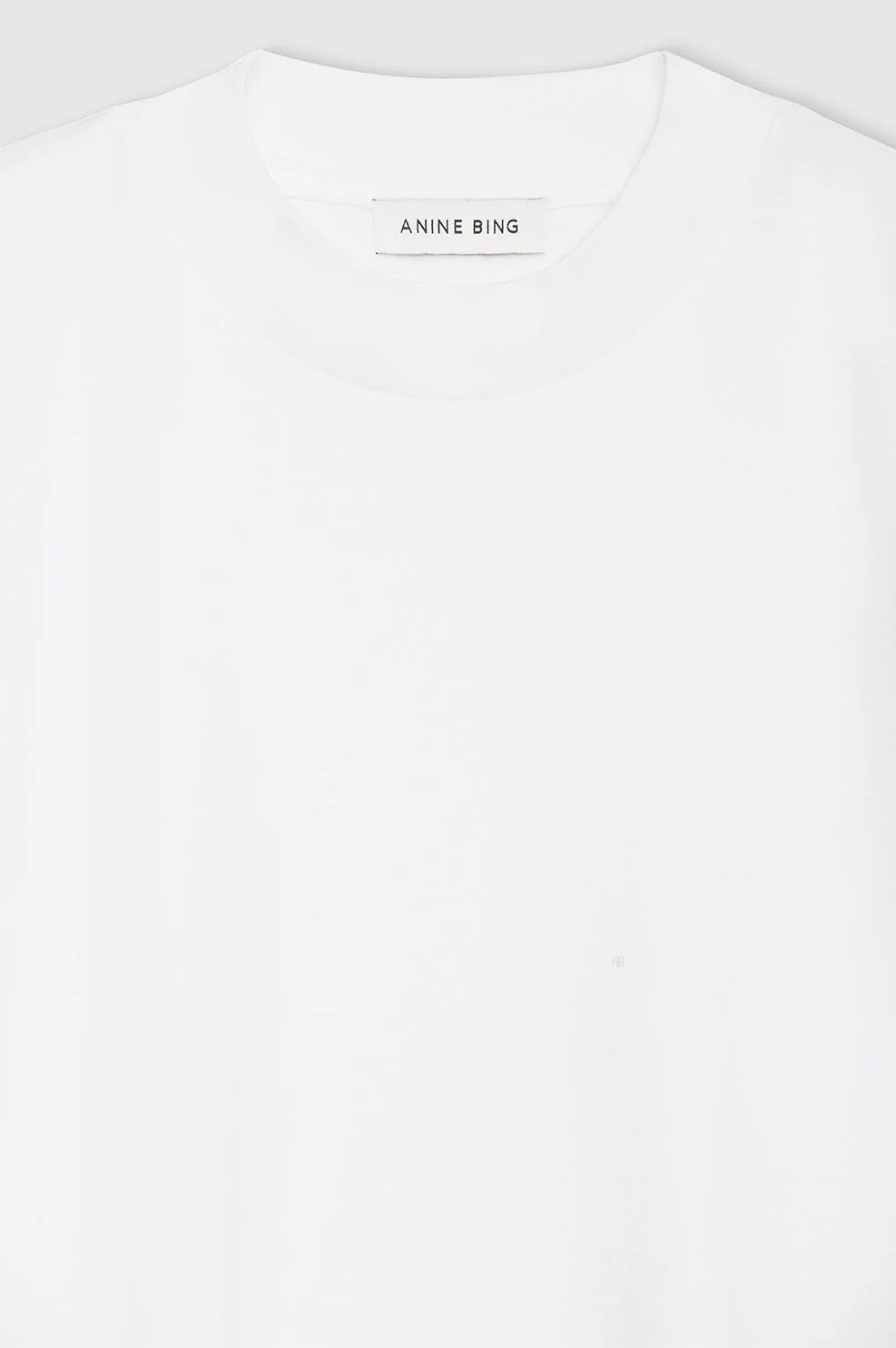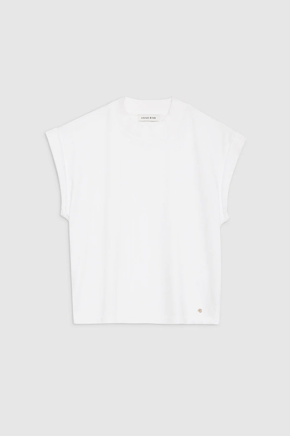 An elevated muscle tee crafted from a heavyweight cotton vintage jersey featuring a mock neckline and folded detailing at each sleeve. Finished with a small stitched ANINE BING monogram charm at the wearer's bottom-left hem.