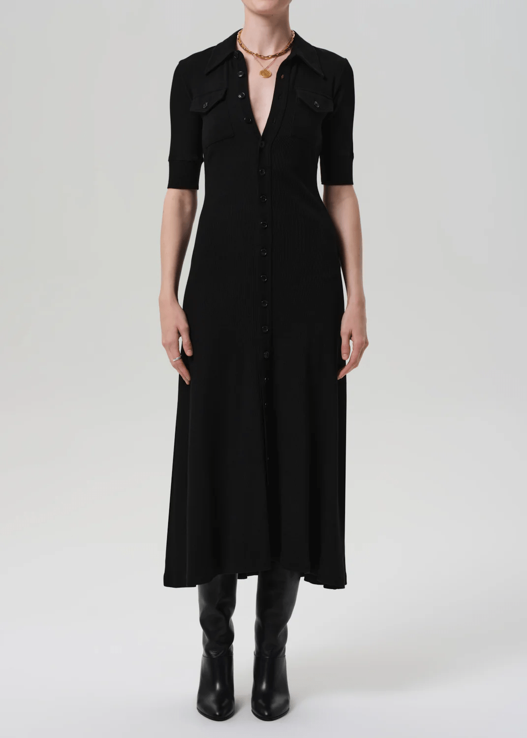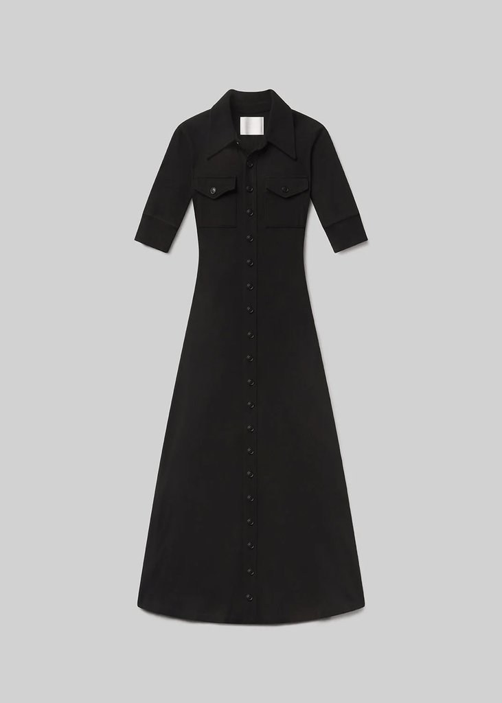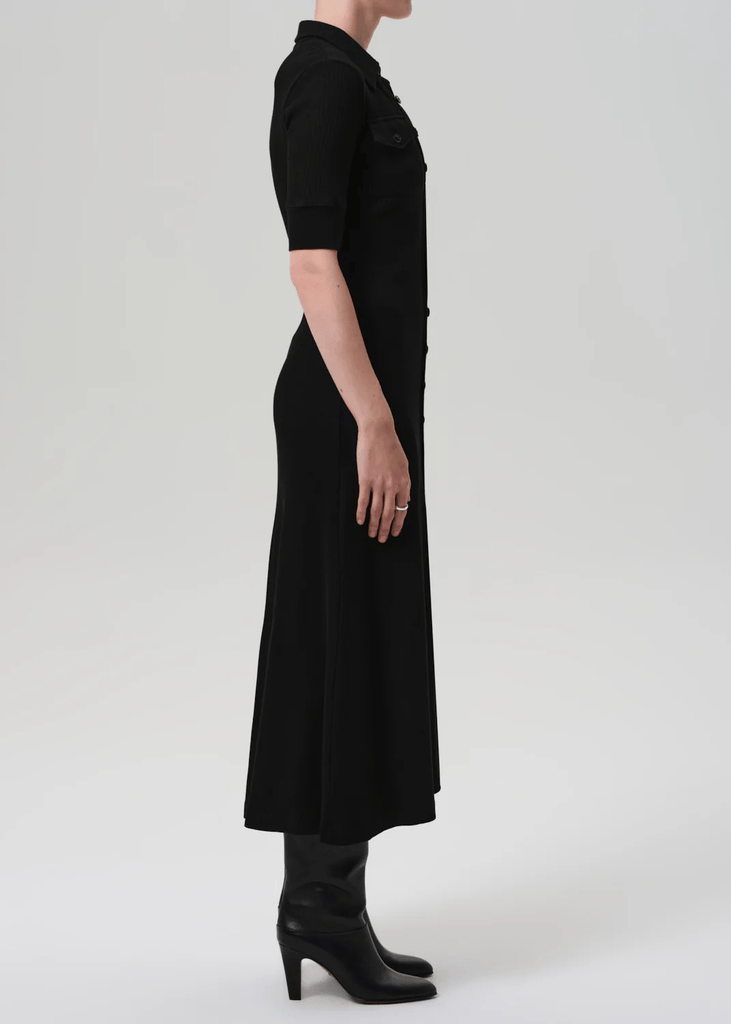 The ‘Amina’ dress is a modern take on the classic polo, cut in a softly structured rib with a button-down front and gently flared hem. Crafted from an ultra-soft, supportive blend of regenerative cotton and lyocell, it offers all-day comfort with a close fit through the bodice. In true black, it’s a polished essential—wear it solo with boots or layered over a slim turtleneck for cooler days.