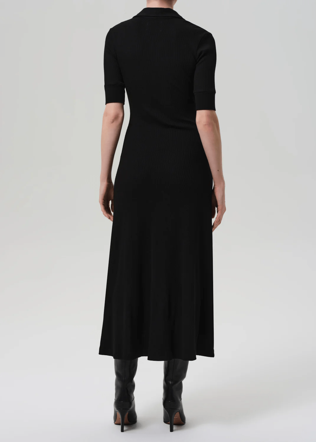 Looks Like: True black elbow sleeve below the knee polo dress