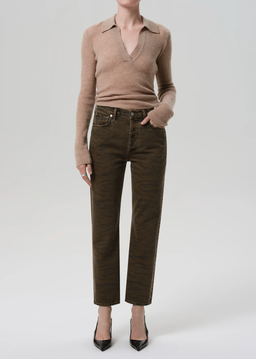 Looks Like: Brown denim pant with zebra print