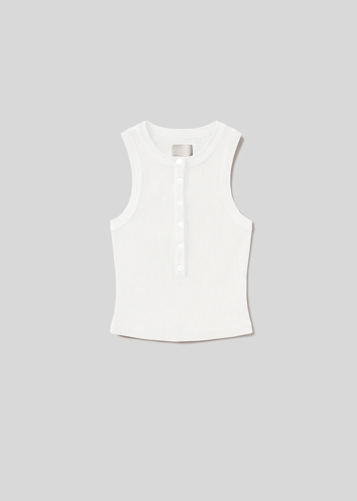 The Carolyn Tank is a button-front staple, crafted from signature rib fabric for a form-fitting silhouette. Perfect for layering with tonal pieces or wearing on its own, this versatile tank offers effortless style that works for any occasion. Pair it with high-waisted denim for a sleek, streamlined look or dress it up with a blazer for a more polished vibe.