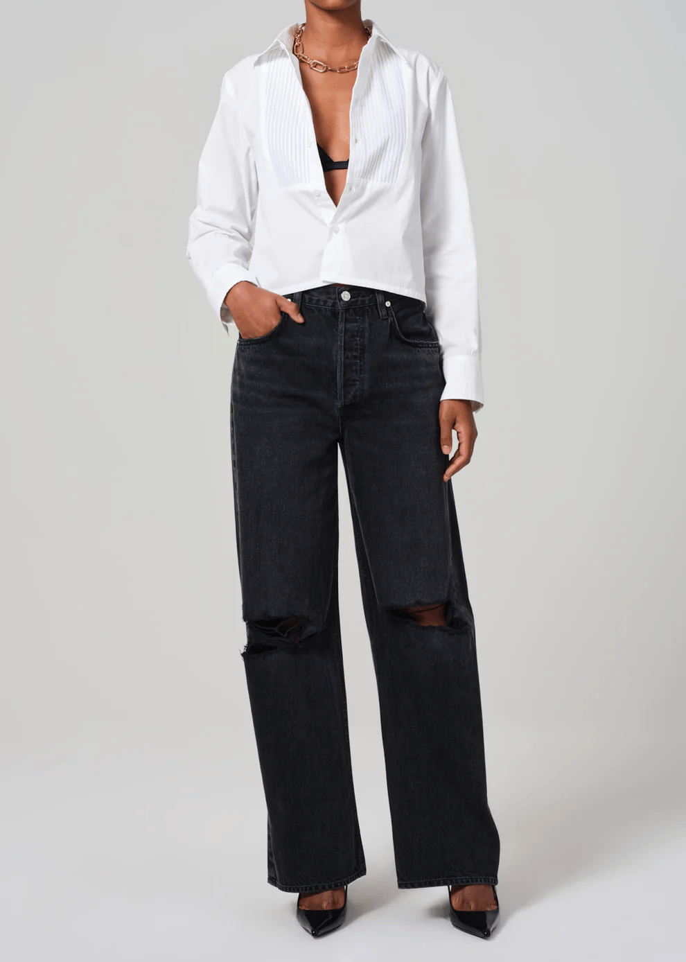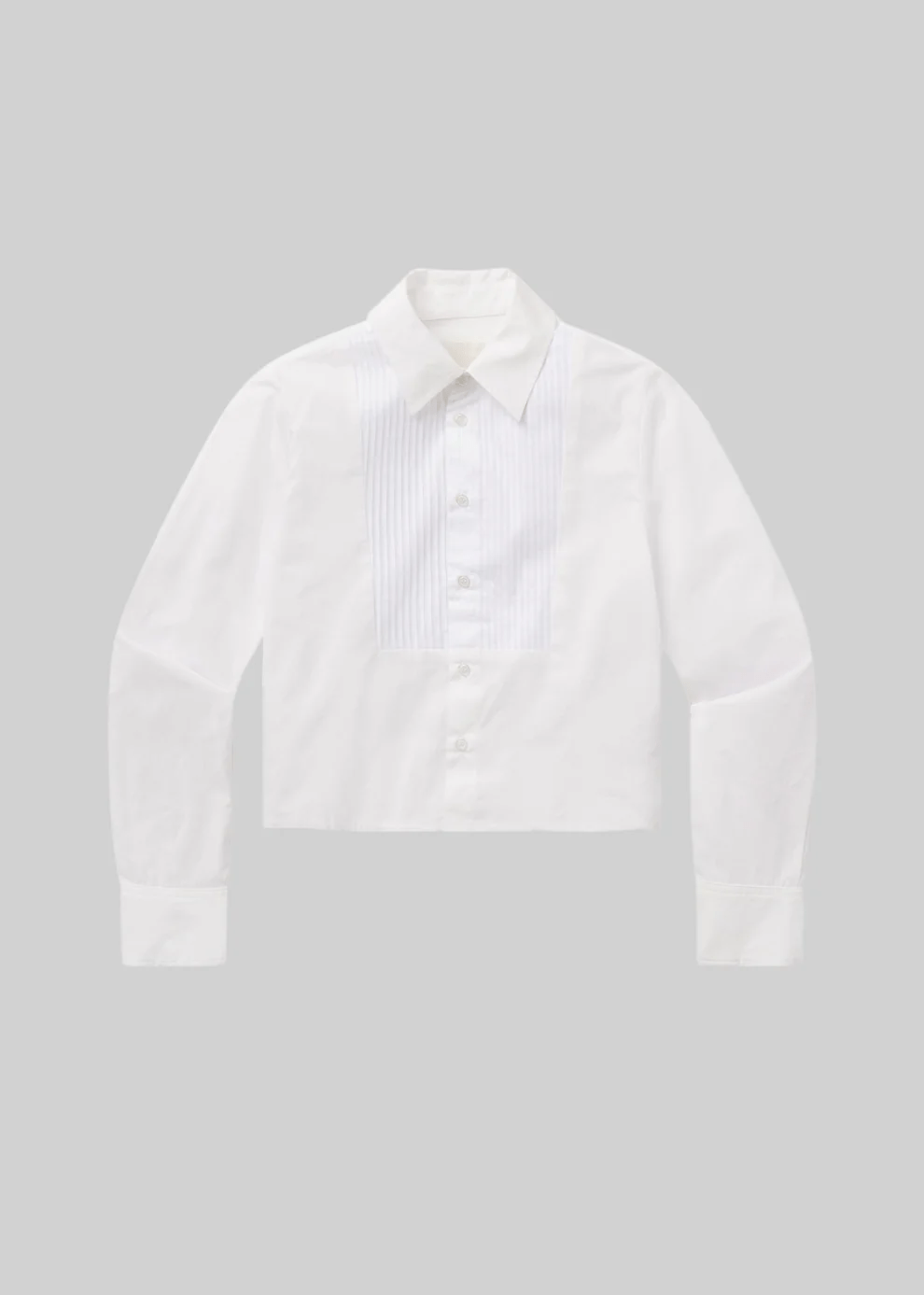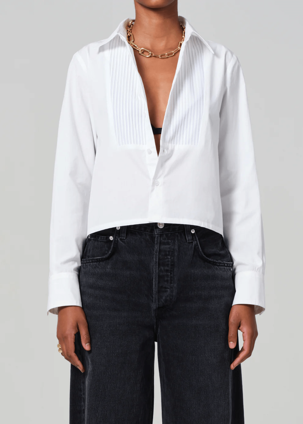 Looks Like: Stark white cropped top with tuxedo detailing across the front