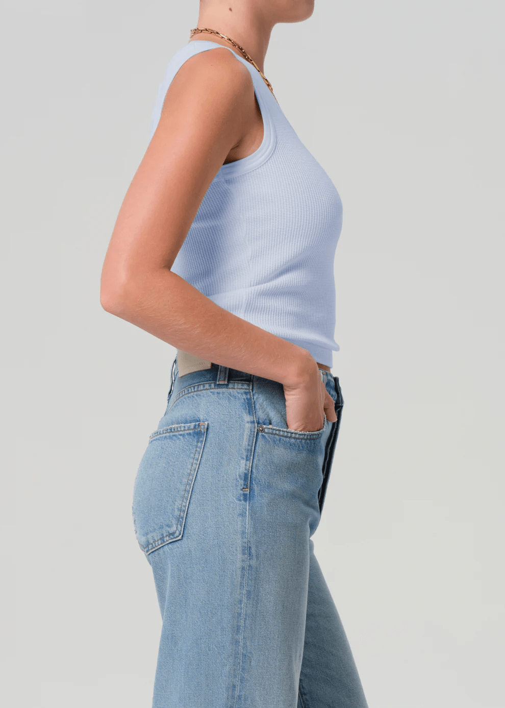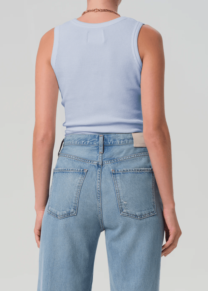 The Inez Waffle Tank is crafted from midweight soft cotton with a waffle thermal texture for added dimension and comfort. The sleeveless, fitted silhouette offers a clean, versatile shape, while periwinkle adds a light, airy tone—perfect layered under knits or worn alone with high-rise denim.