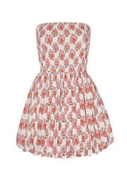 Sadie is an effortlessly chic strapless mini dress crafted from breezy cotton voile lurex dot fabric with an allover paisley block print. Designed in a pull-on style, it features a flattering fully smocked bodice and a playful bubble hem skirt. Perfect for your next getaway, this versatile piece transitions effortlessly from day to night.