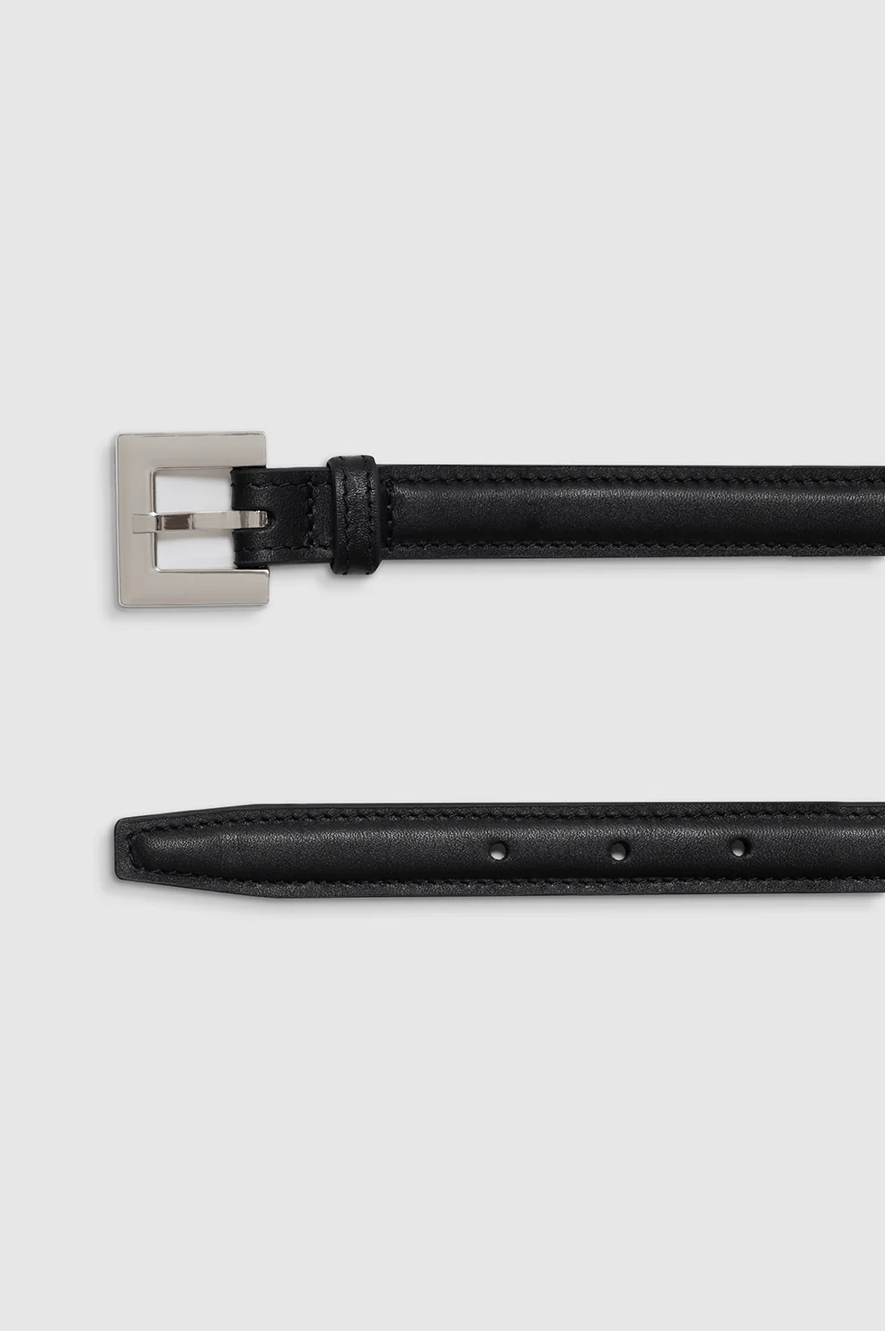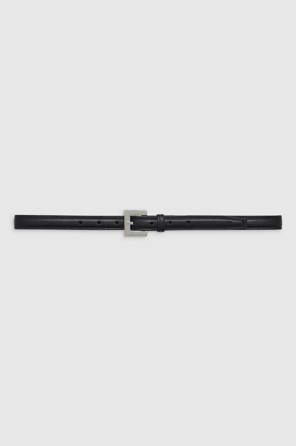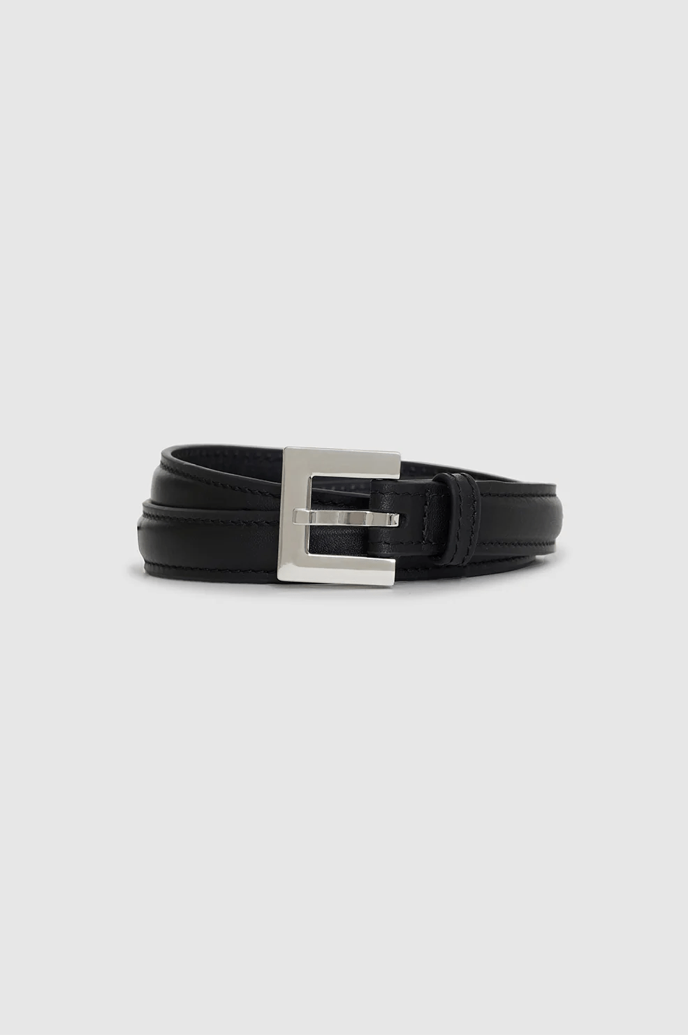 The Nicola Belt is crafted from black 100% leather with a slight sheen. This everyday style is slightly padded and features a custom square-shaped buckle in silver-tone hardware engraved with subtle ANINE BING branding.