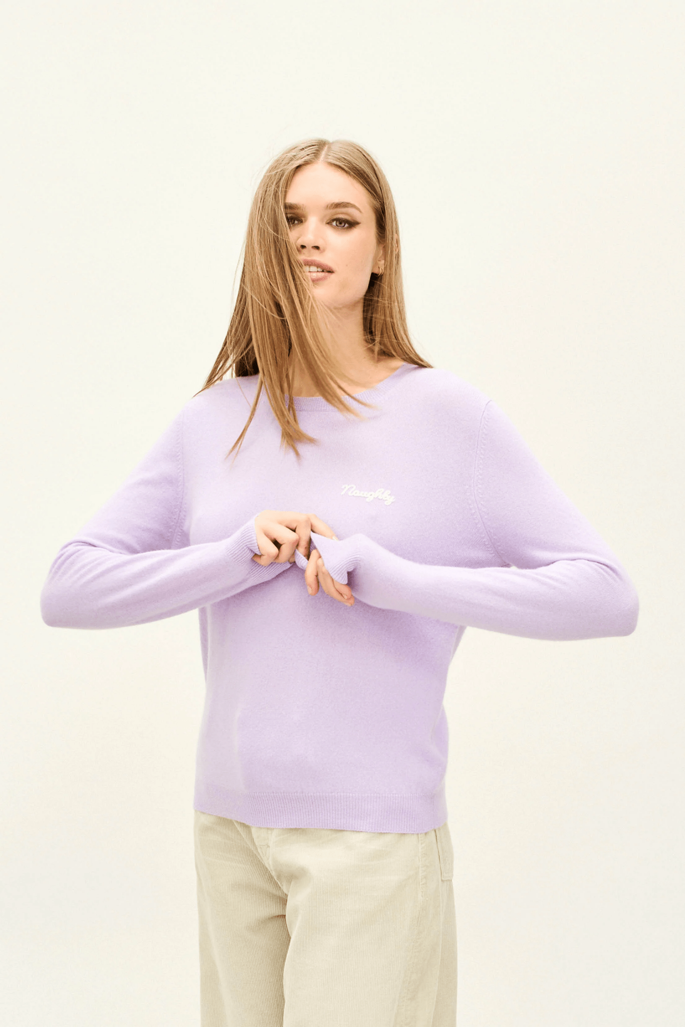 Jumper 1234 cashmere jumper. Lilac cashmere crew neck jumper with cream 'naughty' chain stitch embroidery on the chest and 'but nice' on the back. We love this jumper so much and just couldn't cut down the colour options, so have offered it in all 6! Oh and its also true to size.