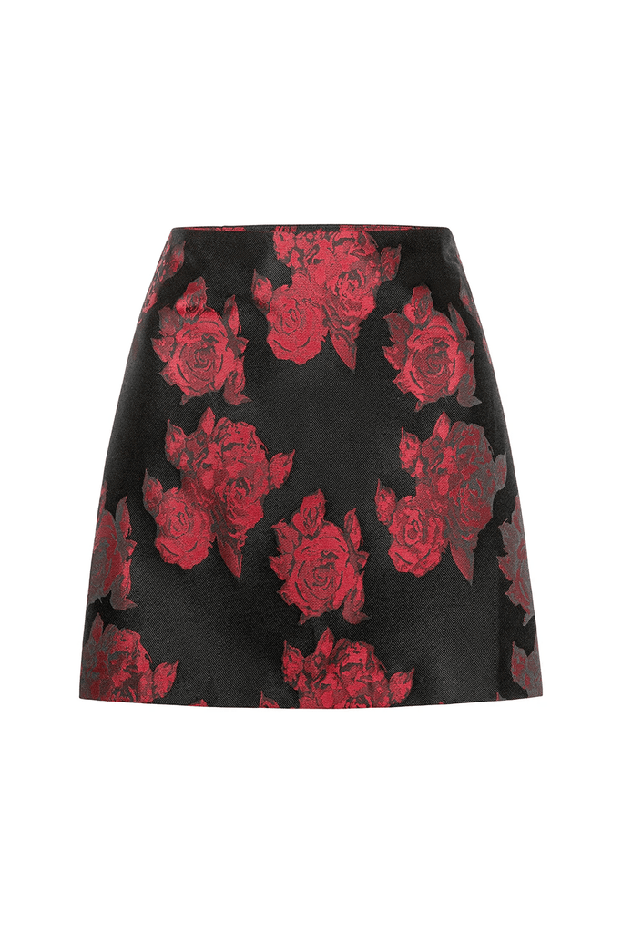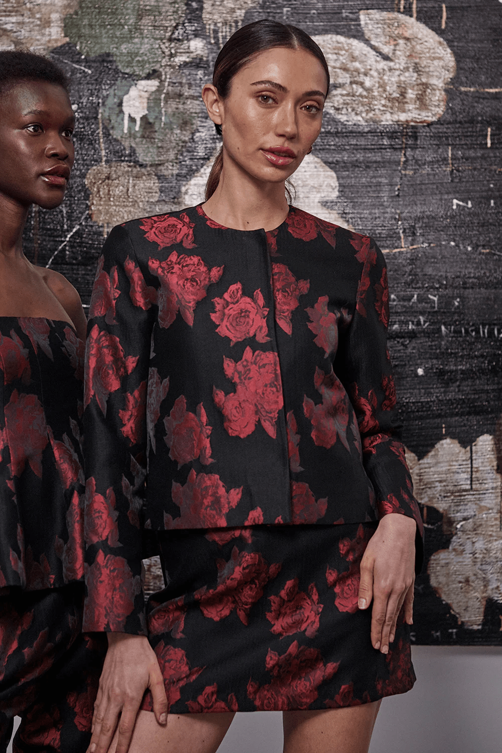 The Enza mini skirt is cut from a striking Midnight Rose brocade in a flattering slight A-line silhouette with a hidden side zip closure. A perfect holiday piece, it pairs effortlessly with everything from our cozy black Julissa sweater and tights to the matching Yanni jacket—ideal for all your soirées this season.
