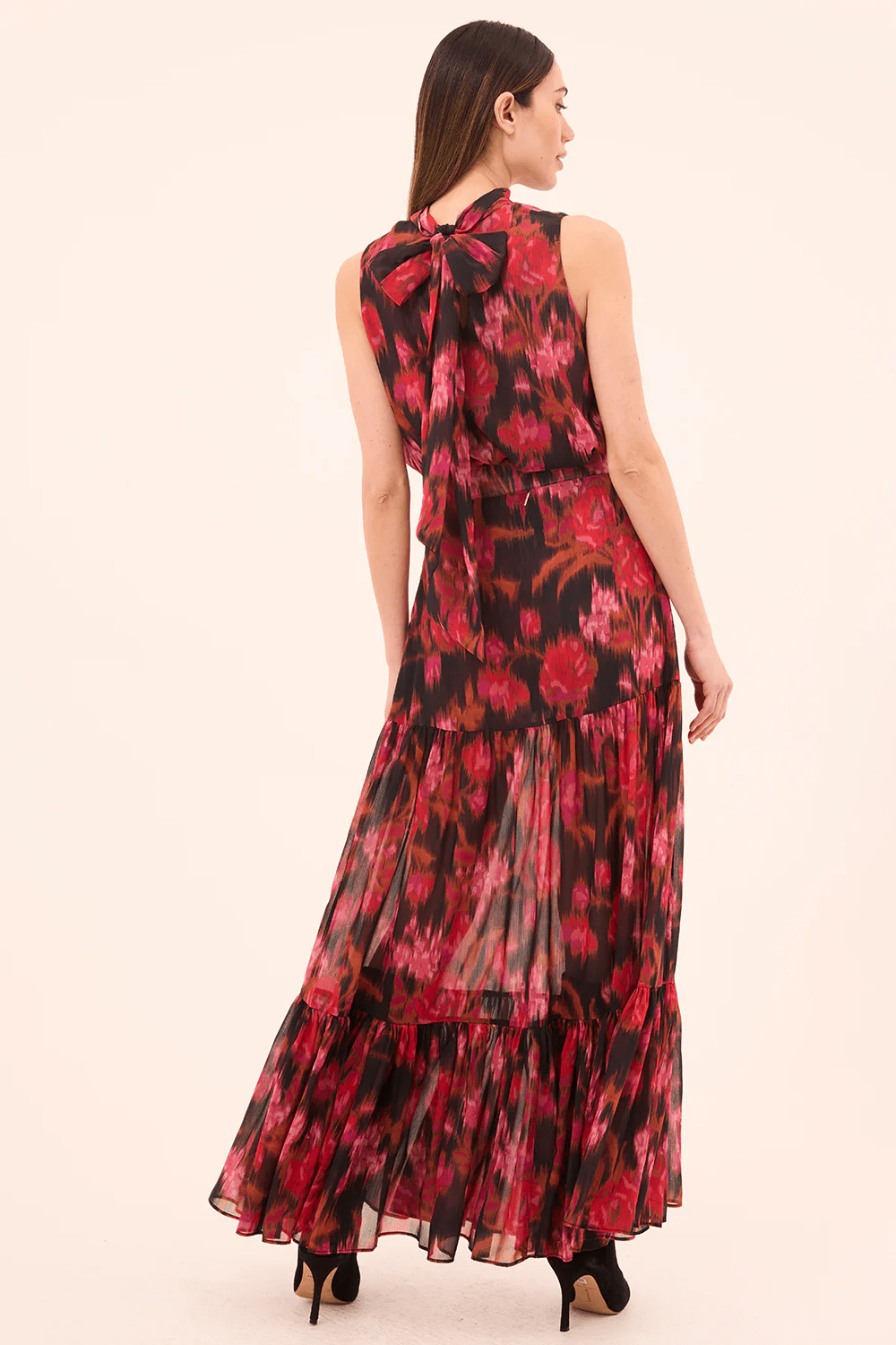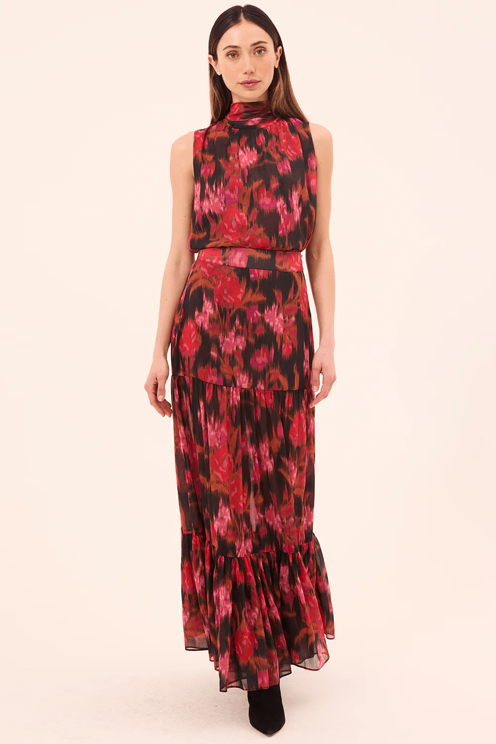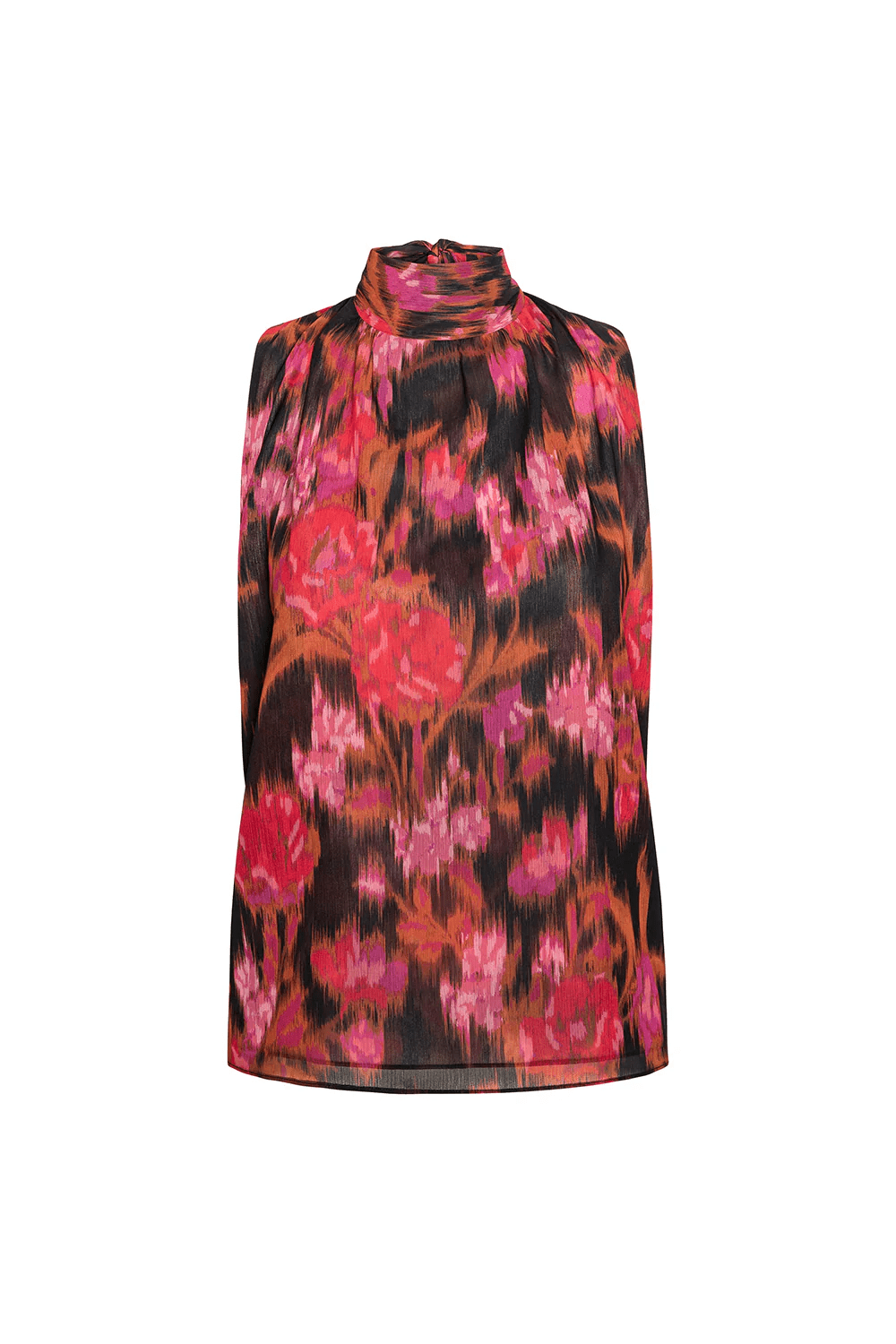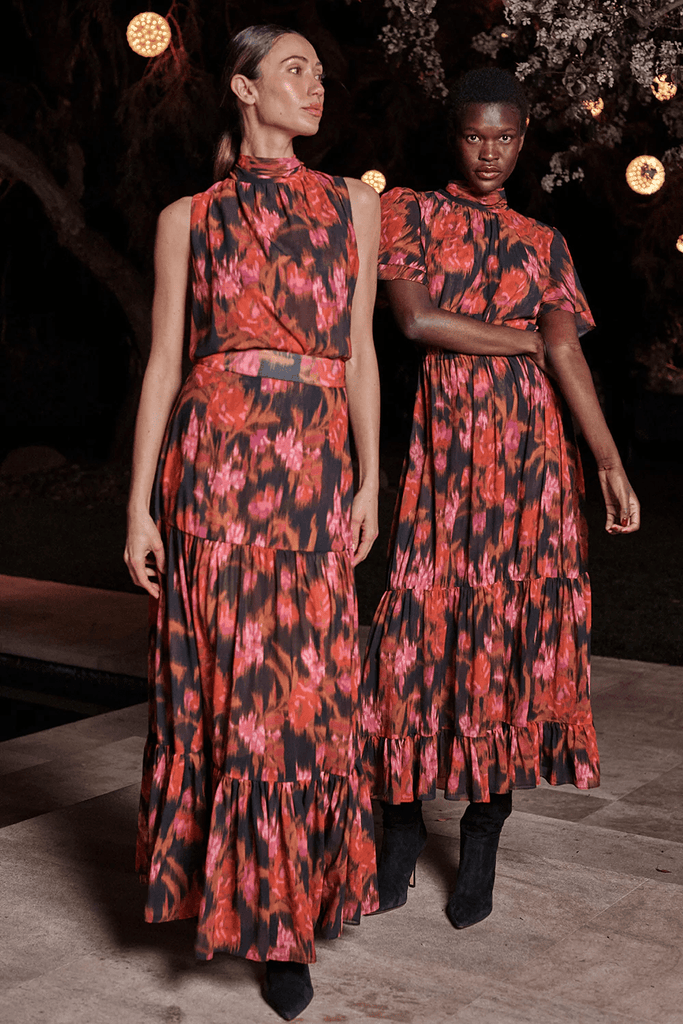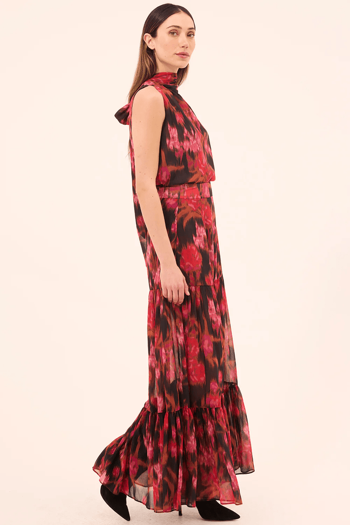 The sleeveless Luka top is an easy high-neck silhouette cut from a vibrant Blur Flora print chiffon. Featuring a self-tie at the neckline, this versatile style can be paired with everything from the coordinating Mavi skirt to wide leg trousers under an oversized blazer.