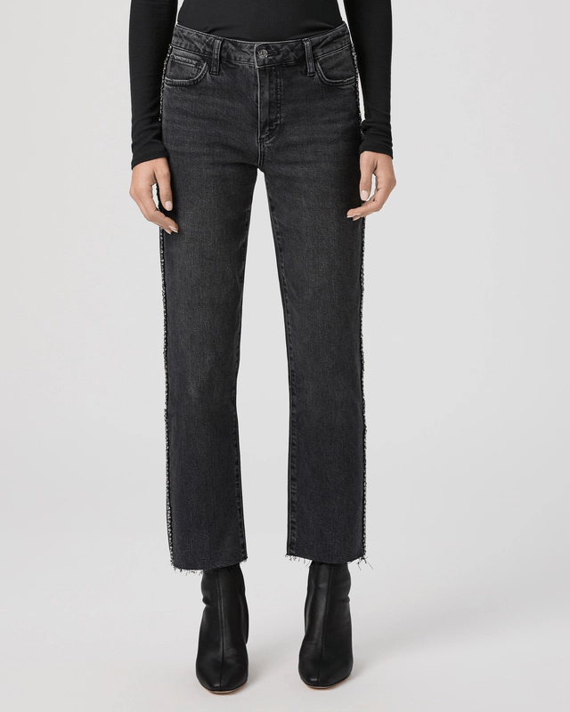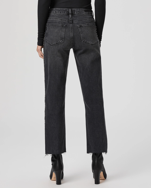 The Mason Ankle is our mid-rise straight leg with an ankle length inseam. In a washed black with a gunmetal embellished side seam detail, this pair is crafted from heritage-inspired denim with a soft hand-feel and a hint of stretch.