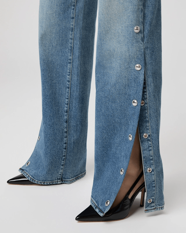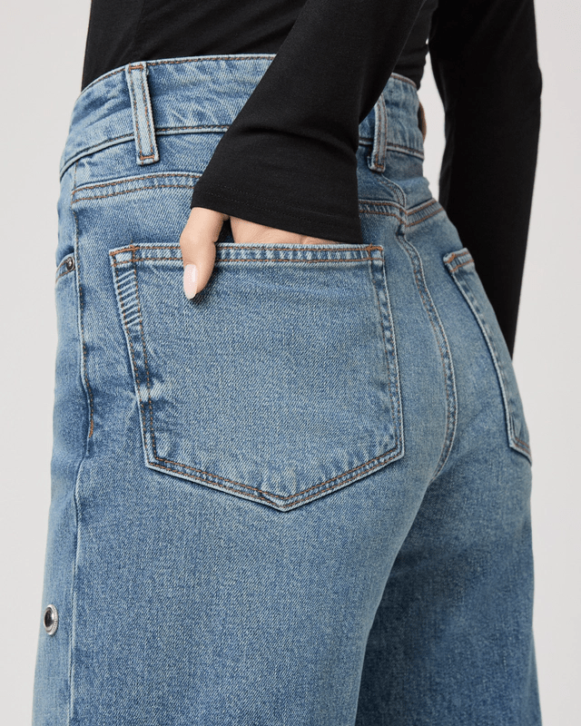 Sasha is our high-rise wide leg with a fitted top block and a slightly relaxed fit. In a light/medium wash with silver side seam snap buttons, this pair is crafted from heritage-inspired denim with a soft hand-feel and a hint of stretch.