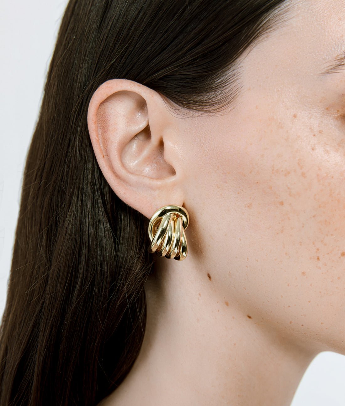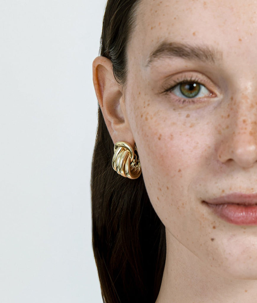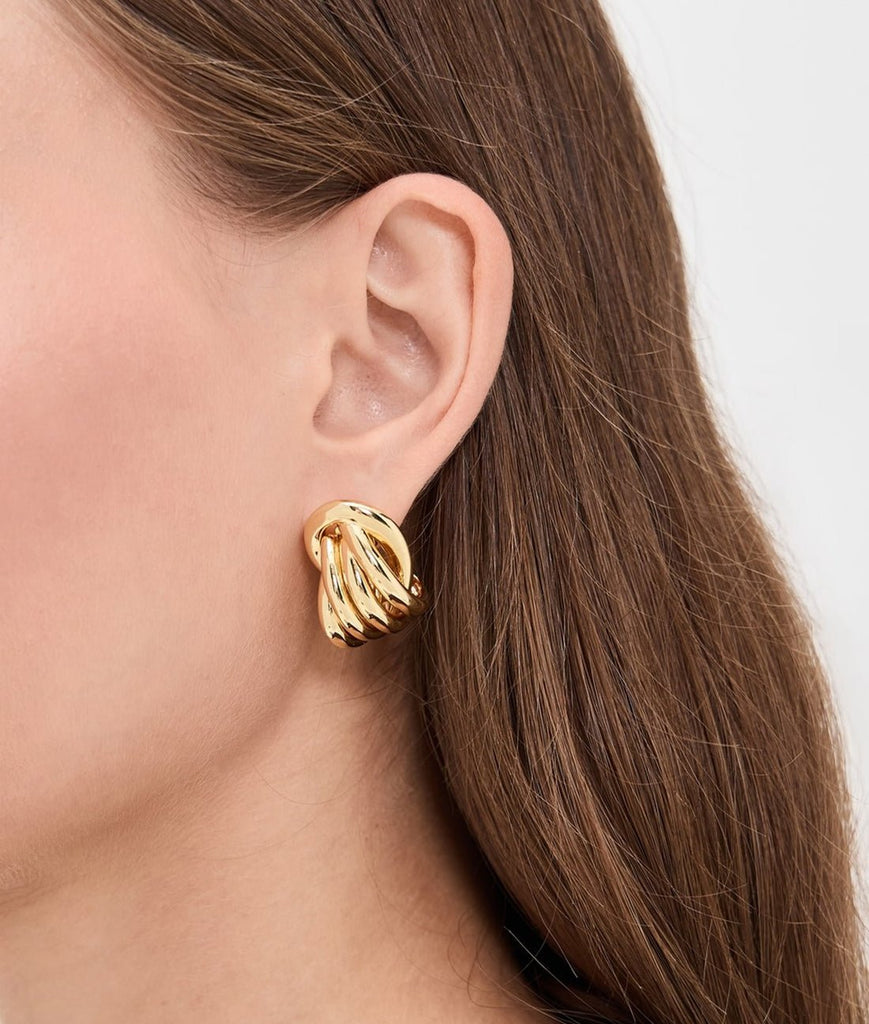 Sculptural and refined, the Roux Earrings reimagine the classic knot silhouette in a bold, polished form. Crafted in 14k gold vermeil, this multi-band design creates dimensionality and structure with a sleek post-back finish—an effortless upgrade to everyday looks or tailored dressing.