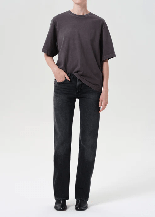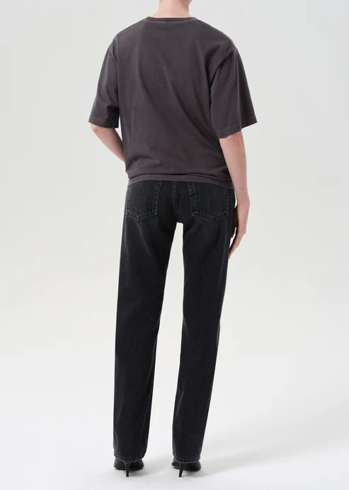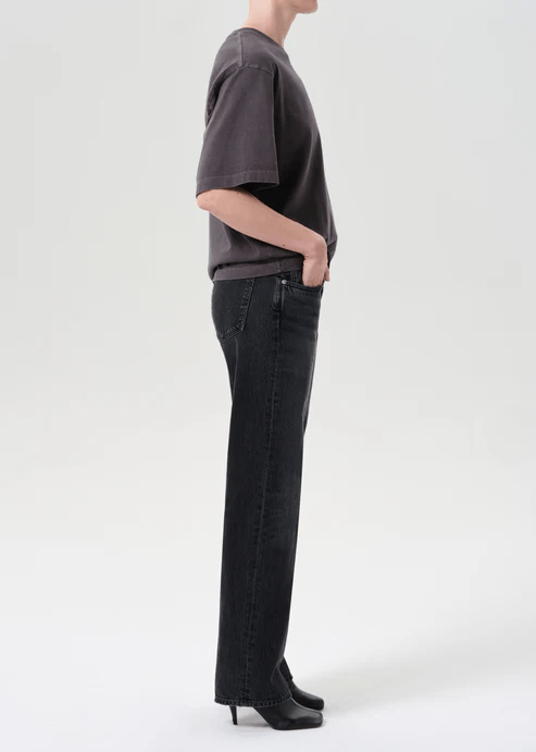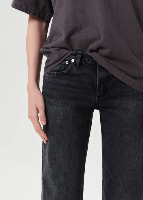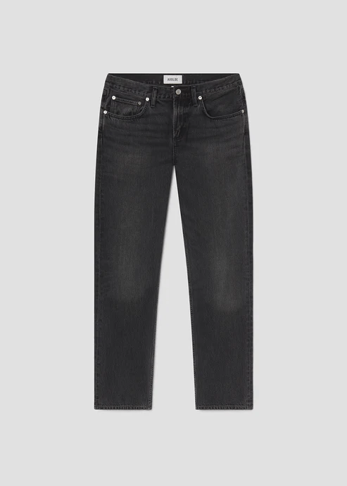 The Low Rise Slim sits low on the waist with a streamlined leg for a modern, minimal silhouette. This dark worn in, washed out black denim pant is finished with subtle marbling, lending a vintage-inspired edge to the clean shape. Pair with a structured top or casual knit for everyday ease.