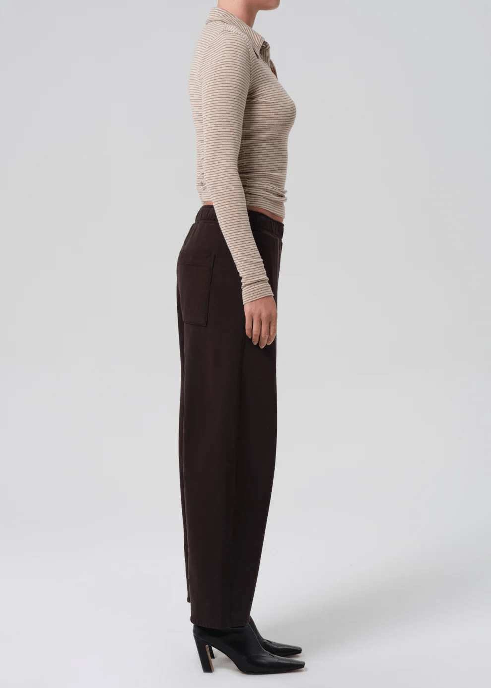 The Miro Sweatpant is crafted from soft brushed fleece with a cozy, plush feel. The medium to dark brown silhouette features a relaxed, tapered fit with a drawstring waist and ankle-length finish. Perfect for lounging or styled with matching sweat tops for a coordinated, casual look.