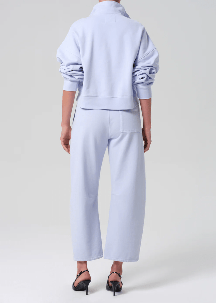 The Miro Sweatpant is crafted from soft brushed fleece with a cozy, plush feel. The light blue silhouette features a relaxed, tapered fit with a drawstring waist and ankle-length finish. Perfect for lounging or styled with matching sweat tops for a coordinated, casual look.