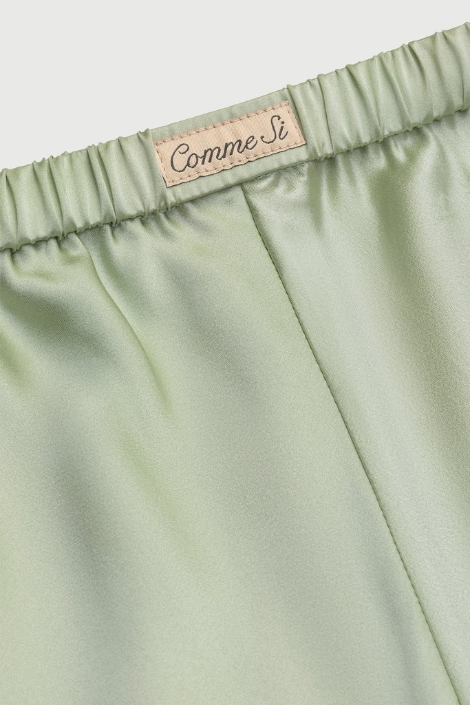100% Silk. OEKO-TEX certified. Cut on bias. Fully covered elastic band. Cursive Label. Made in USA.