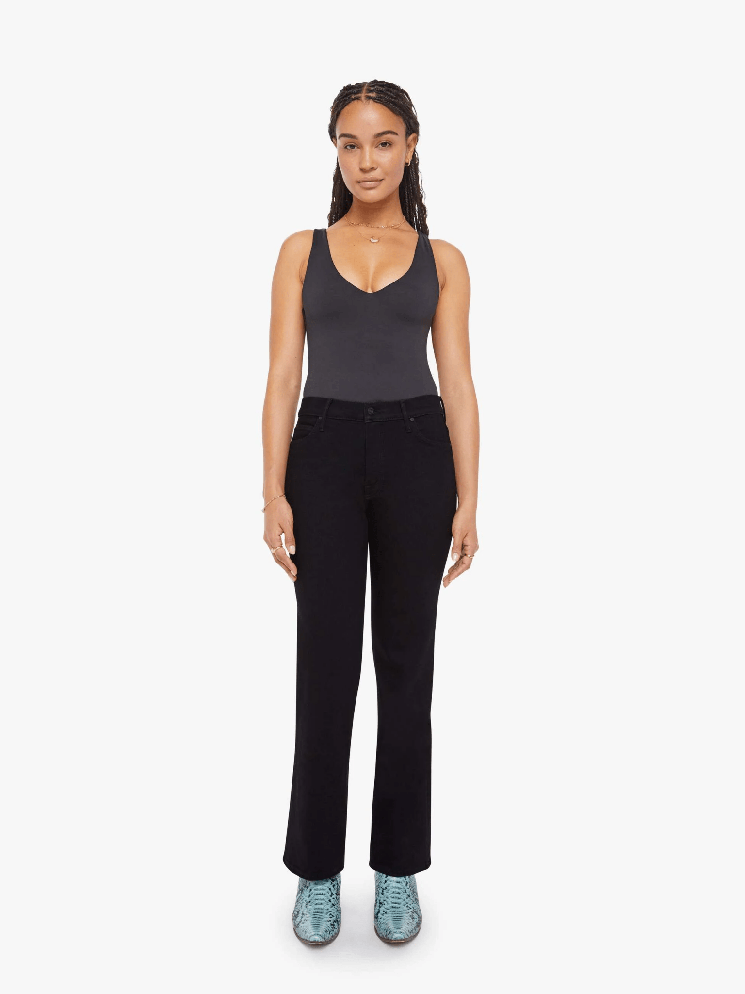 A high-rise straight leg jean with a 30-inch inseam and a clean hem. Made from stretch denim, Nighty Night is a true black with tonal hardware.