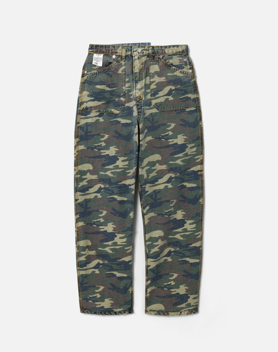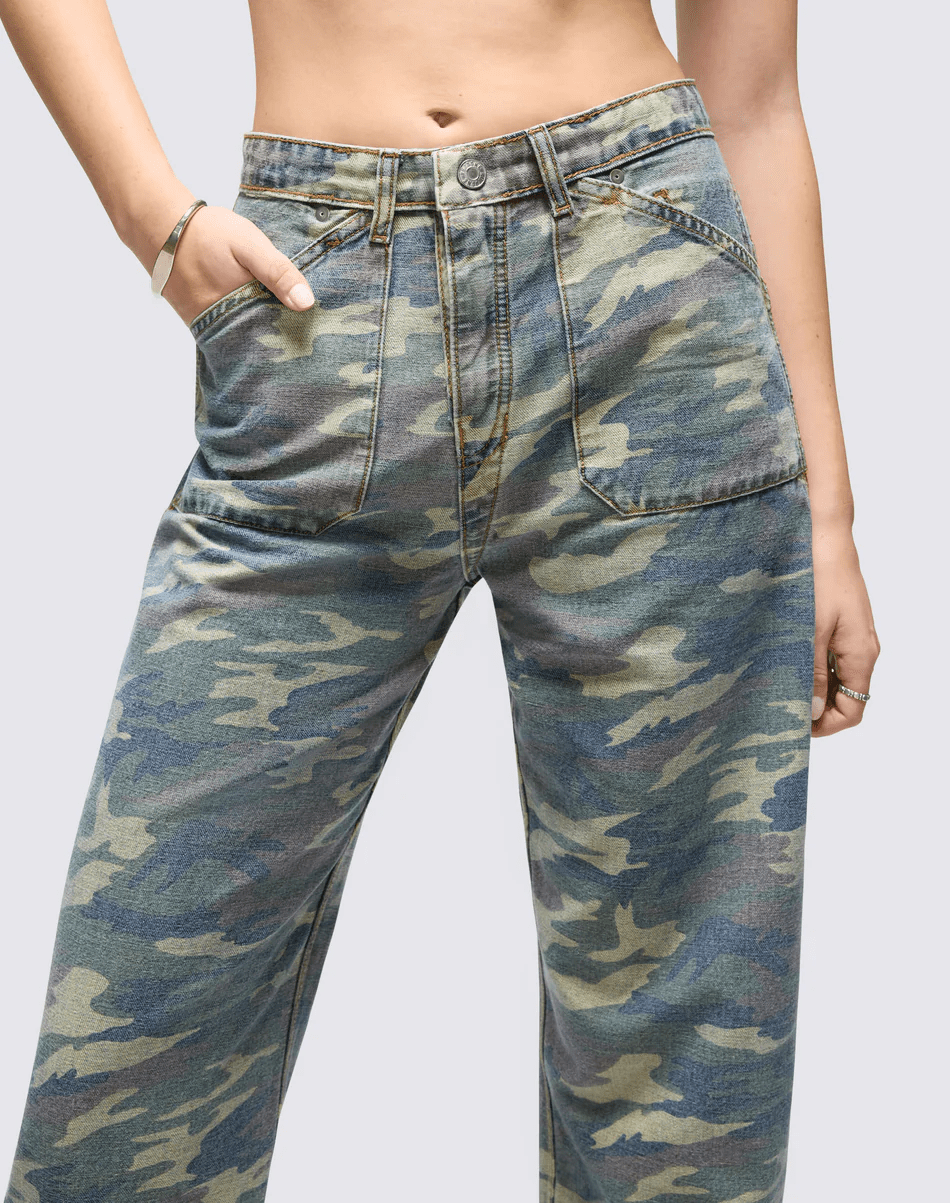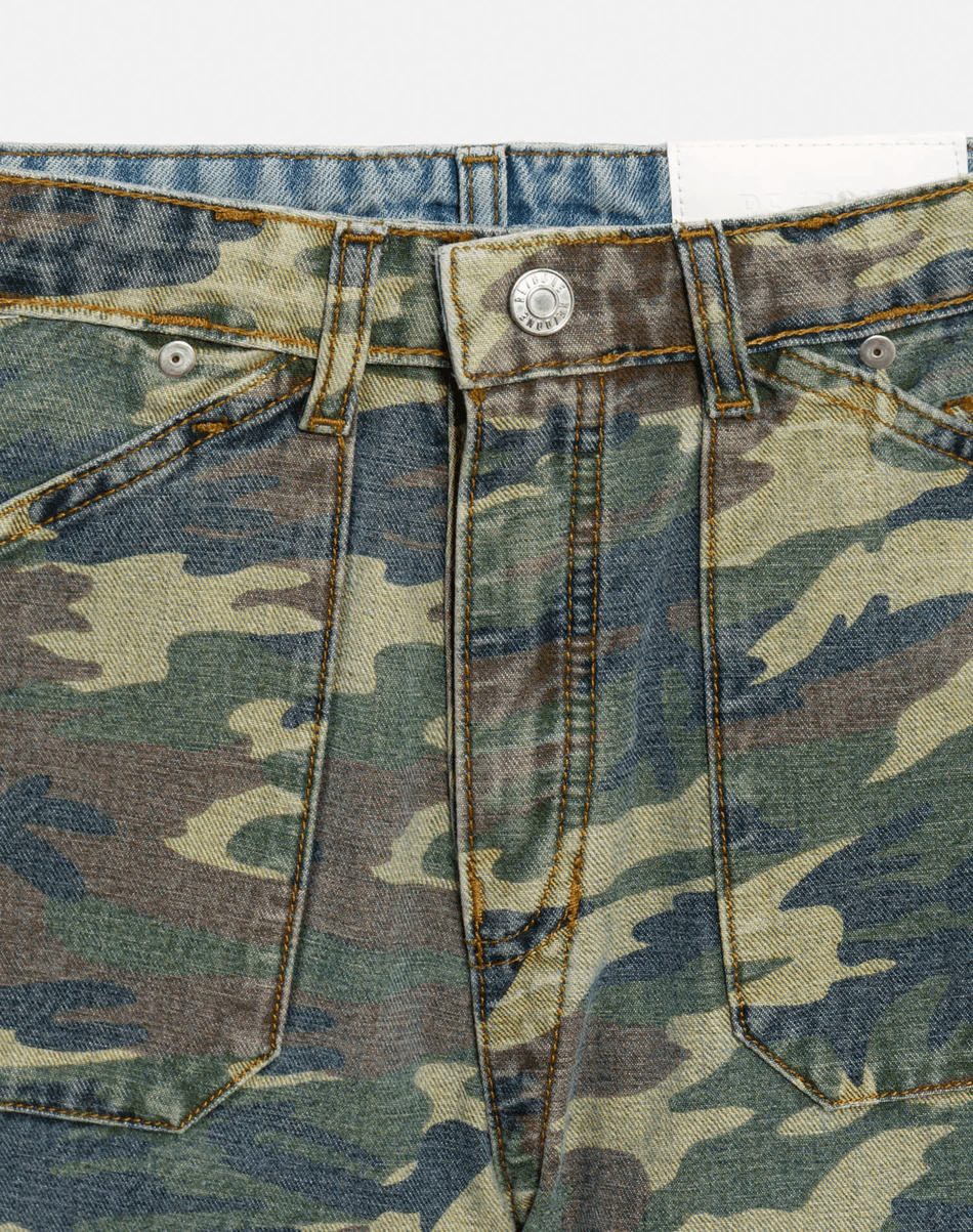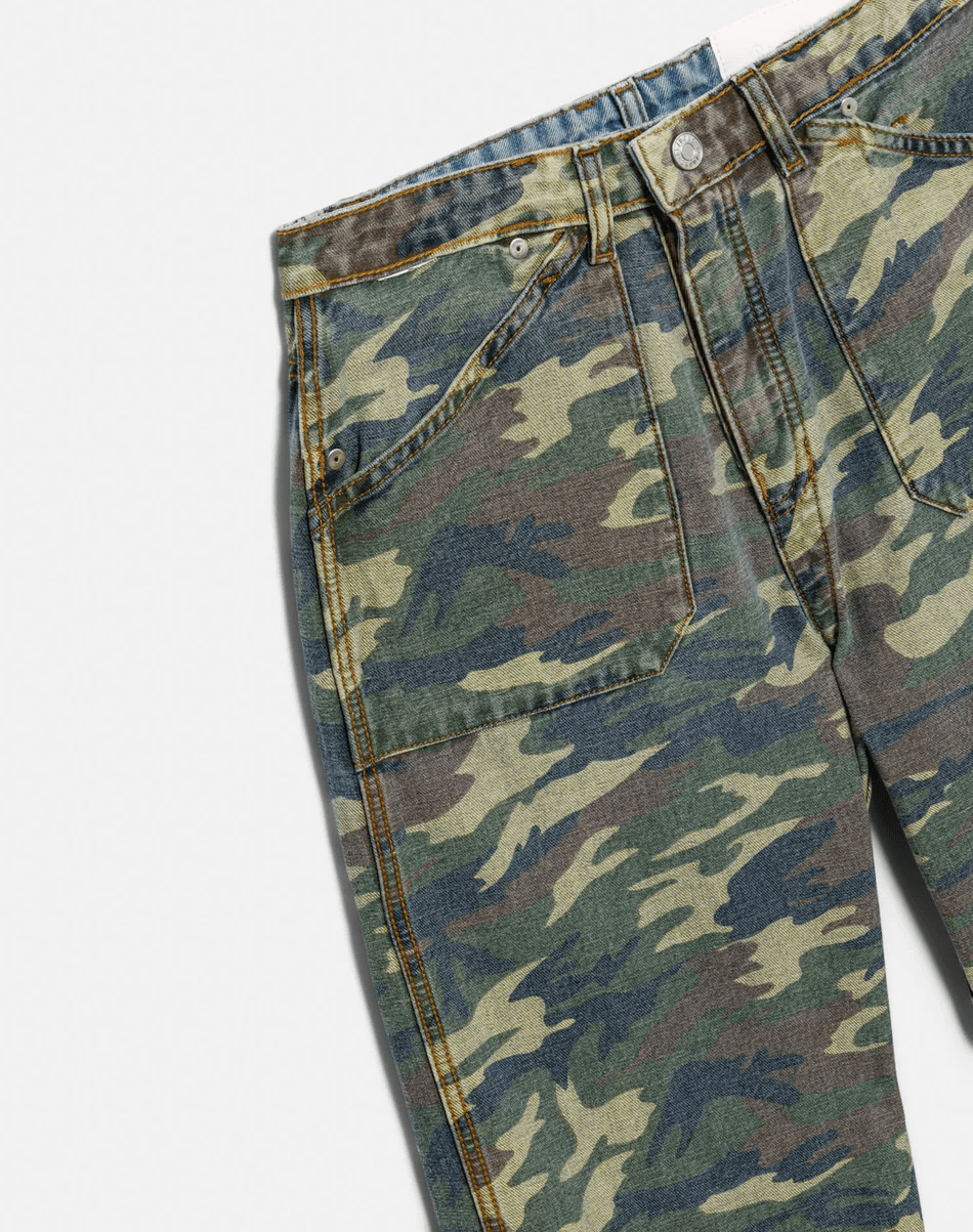 The Rewind Jean flips between a bold printed interior and classic denim exterior, giving you two distinctive looks in one sculpted modern fit. Features an authentic vintage inspired wash on the denim side then on the workwear side features a cool camo print.