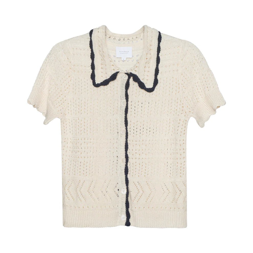Our sweetest style for summer, meet the Agnes Sweater. Crafted from a breathable linen pointelle knit, this sweater features navy trim along the collar and button-down front for a classic touch. Delicate scallop detailing accents the sleeves, collar, and placket, adding a feminine finish. Perfect with your favorite denim or styled with our solid Linen Penny Shorts for an easy, polished look. The fit is close to the body—size up if you prefer a more relaxed, oversized look.
