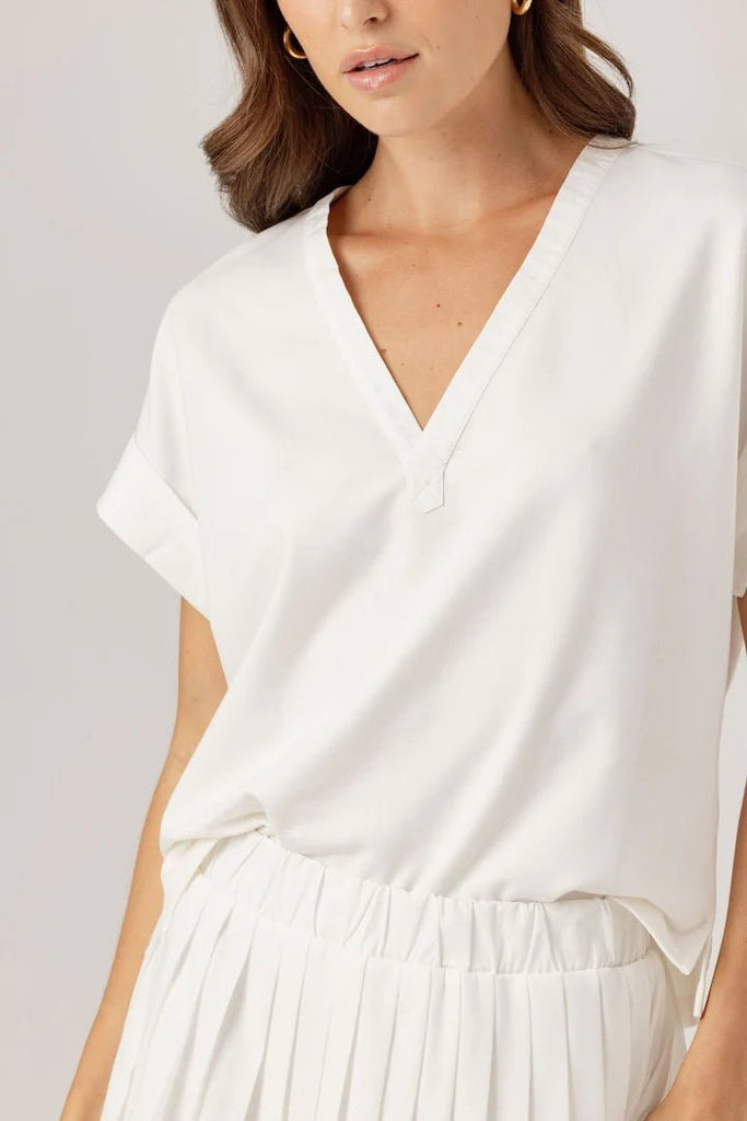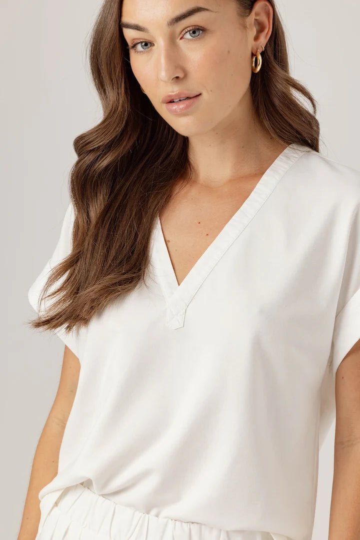 This V-neck pullover is crafted from our signature Lux Wash French Terry for an ultra-soft, lived-in feel. It features a classic jersey-knit neckline and sleeve trim, with rolled cuffs that add a casual, effortless touch. Designed with a slightly oversized, relaxed fit, its length is perfect for tucking into our Noelle Skirt, making it a versatile staple for elevated everyday wear.