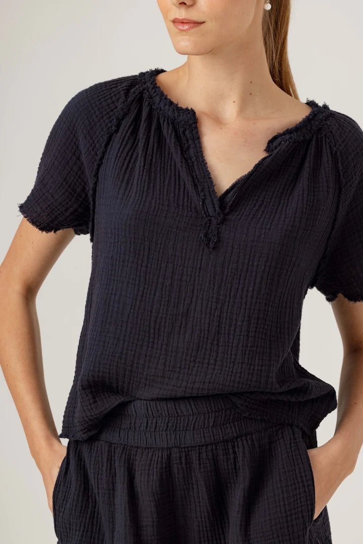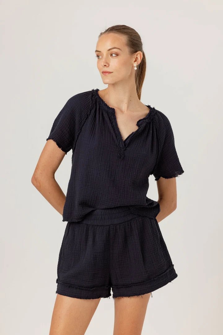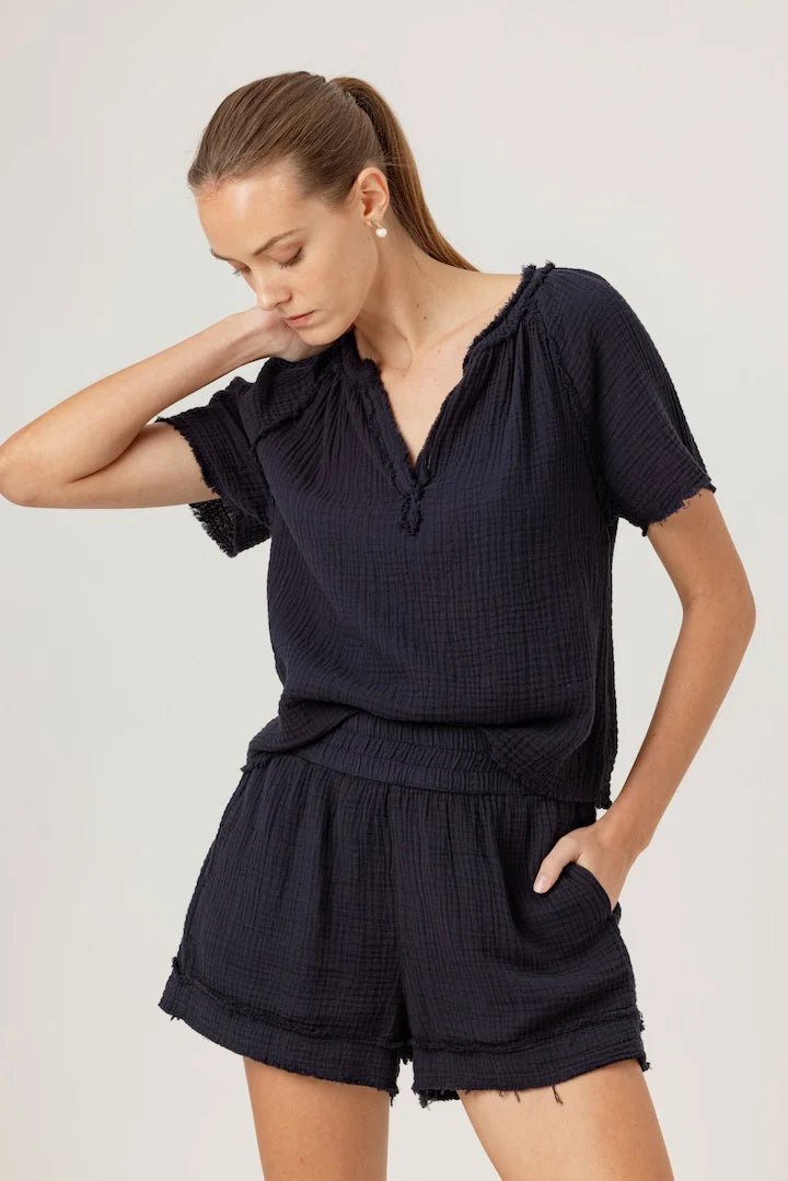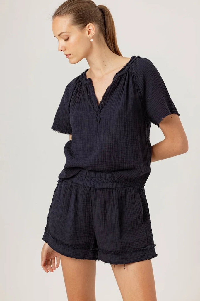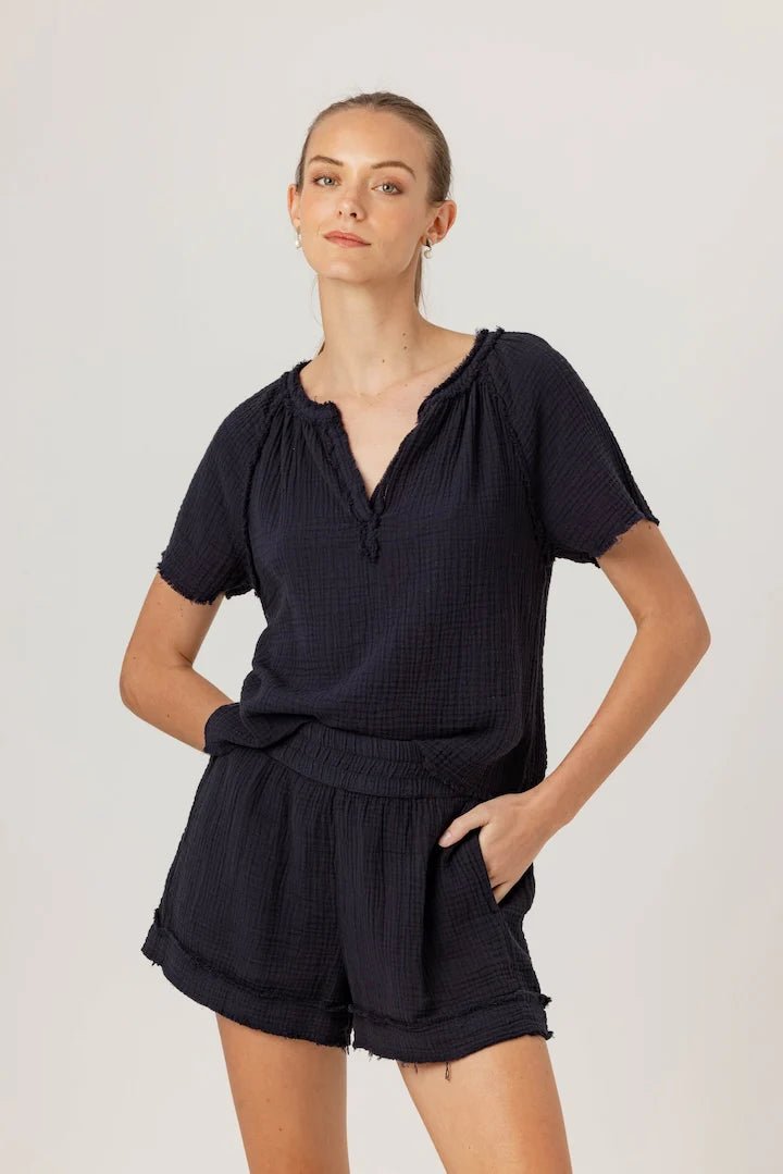 The Mirielle, made in our lightweight and effortless cotton gauze, is the ultimate relaxed staple for warmer months. Designed with raw edge detailing at the hem, sleeves, and neckline, it features a raglan sleeve and a flattering V-split neck. The length hits right at the top of your favorite high-waisted pants or pairs perfectly with our Fuller Gauze Shorts for a breezy matching set.
