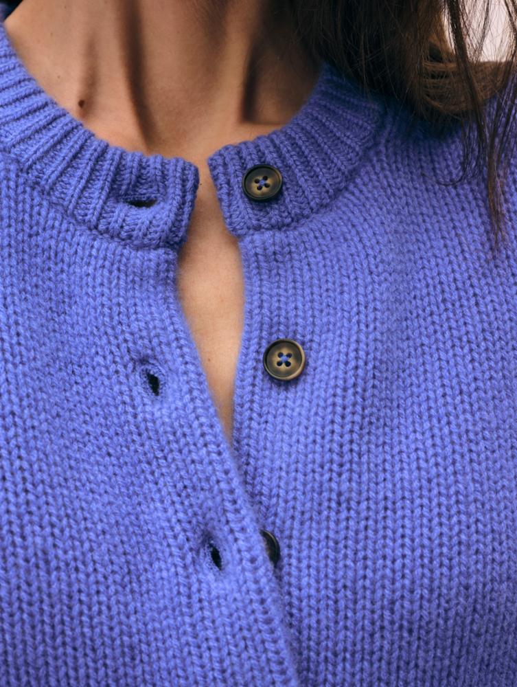 Cashmere Elbow Sleeve Cardigan in Blue Iris - L is backordered and will ship as soon as it is back in stock.