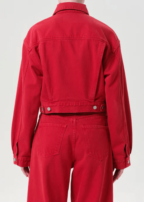 The Radley Jacket is a cropped, structured denim silhouette offered in a clean, saturated red hue. Crafted from rigid, non-stretch cotton denim, it features a defined waist, button front, and timeless trucker details. Pair with tonal reds or vintage-wash denim for an unexpected twist.