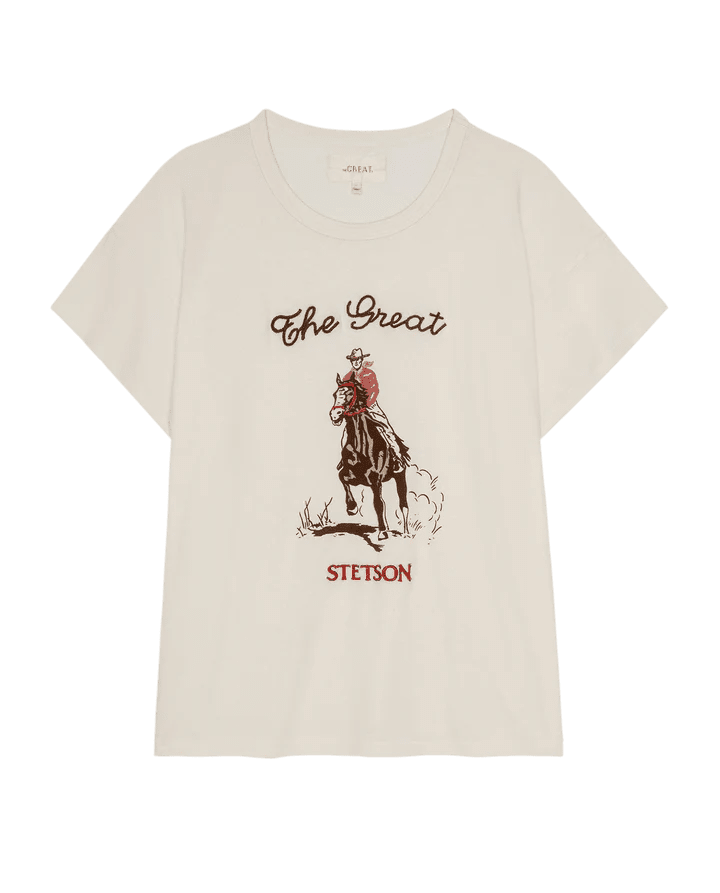 Inspired by a cherished vintage tee, the Boxy Crew is cut generously through the body with flattering updates like angled sleeves and a perfectly balanced length. Designed to become a go-to favorite, this style is made in collaboration with Stetson, whose legacy of authentic craftsmanship has defined the spirit of the West since 1865. It features their signature graphic, printed on soft jersey fabric with a slightly faded application and special embroidered accents that create a perfectly worn-in, vintage feel. Handcrafted locally in Los Angeles, each piece is unique, ensuring no two are alike.
