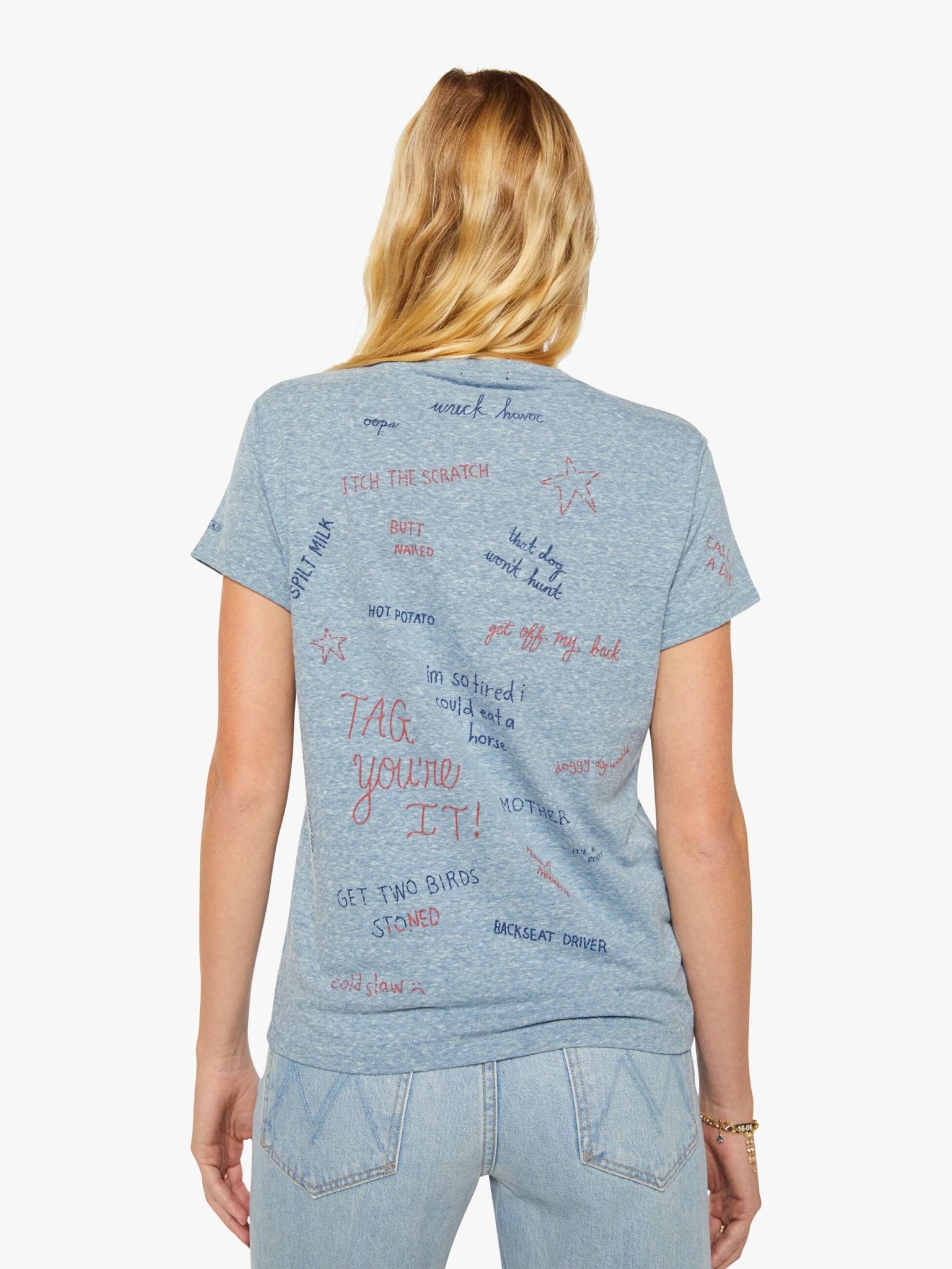 It says without going. A soft crewneck with a slim fit for a vintage look and feel. Made from a cotton blend in overdyed blue, The Boxy Goodie Goodie in Tongue Tied features printed text in red, yellow and blue throughout.