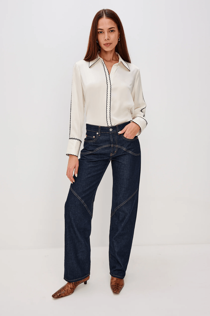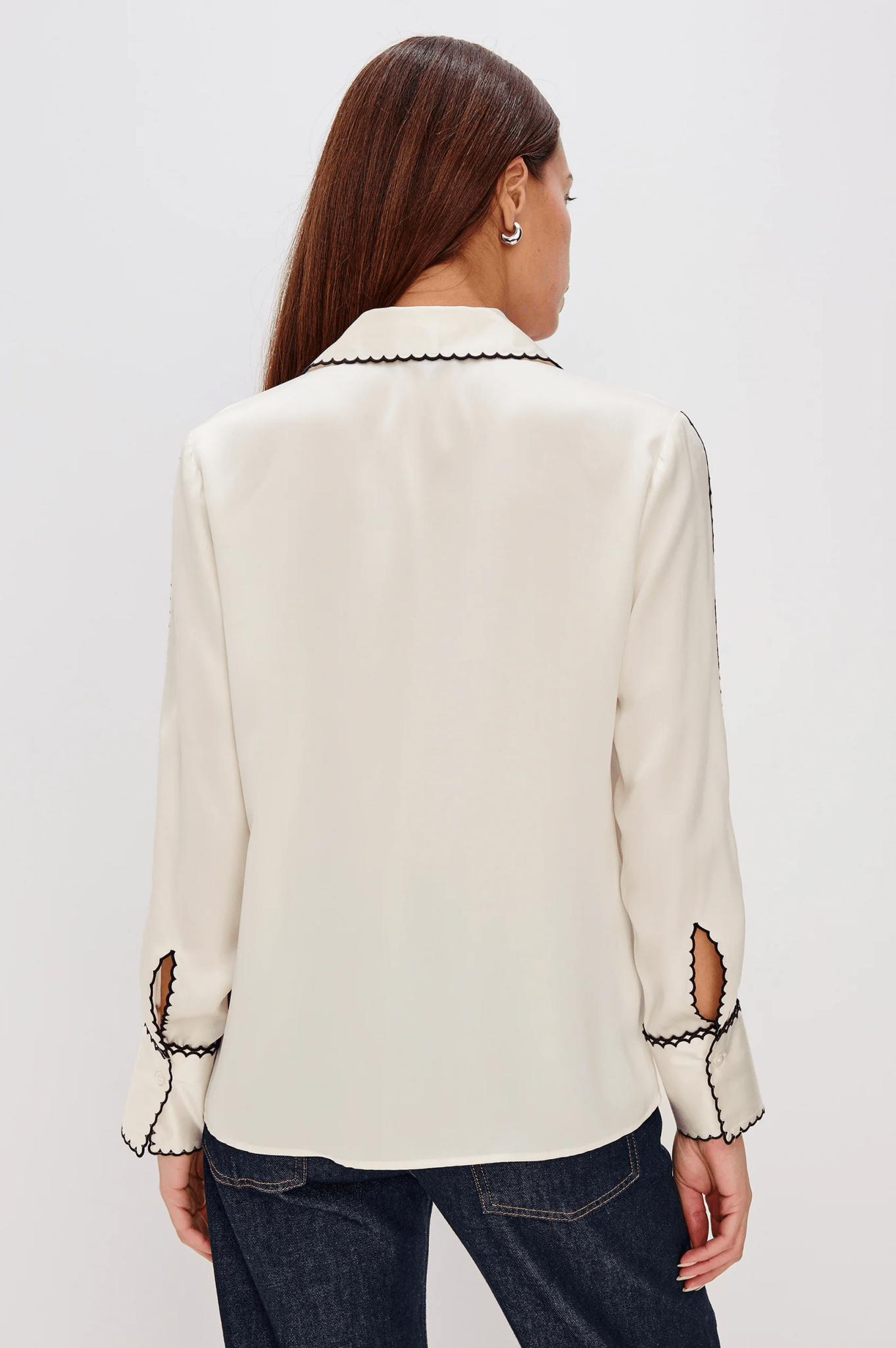 Sophisticated by design, the Aloise is a classic collared shirt in smooth, flowing silk charmeuse, featuring contrast scalloped embroidery with delicate cutouts on the sleeves and front button closures.