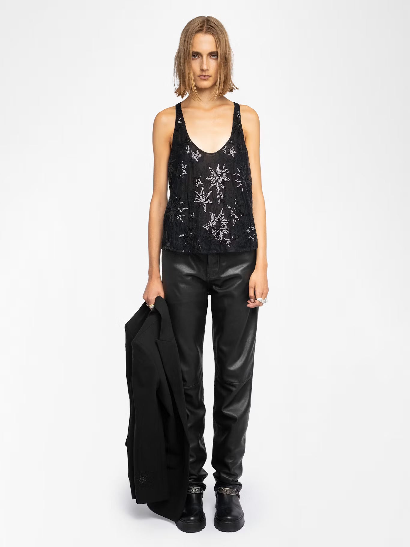 Lace tank top embroidered with sequins and pearls.