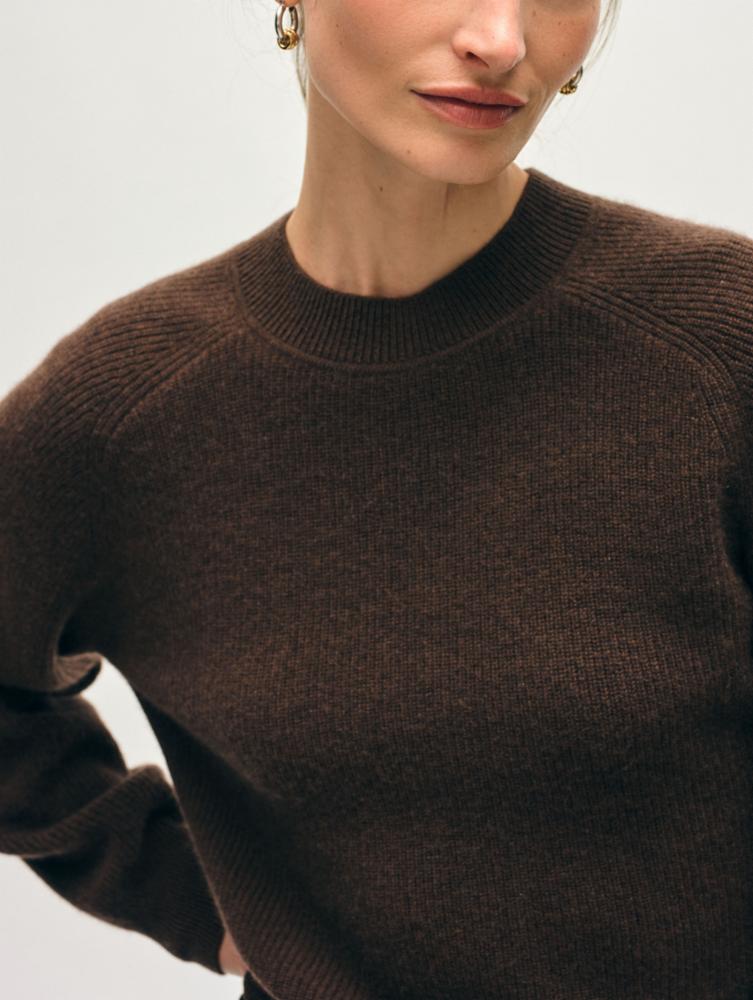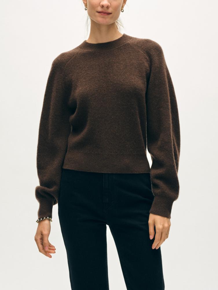 Cashmere Ribbed Blouson Sleeve Crewneck in Maple Brown - L is backordered and will ship as soon as it is back in stock.