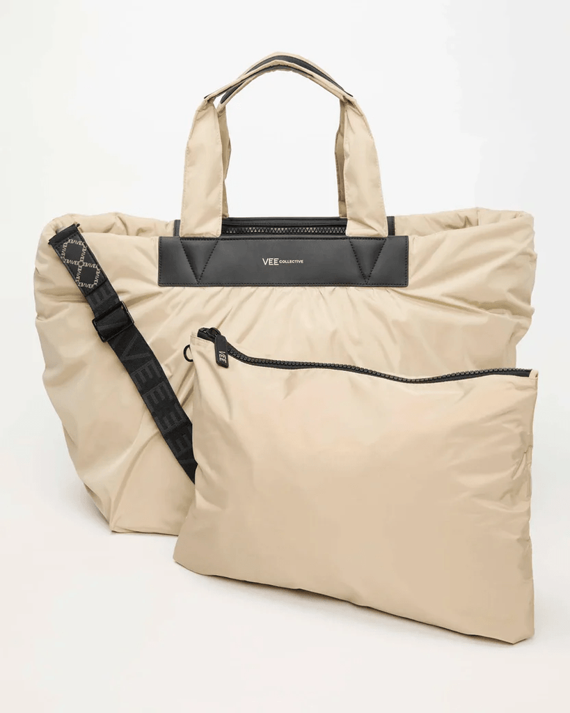 VEE COLLECTIVE Weekender bags are made of 100% recycled and vegan materials. Fabrics are lightweight, durable, water and stain resistant.