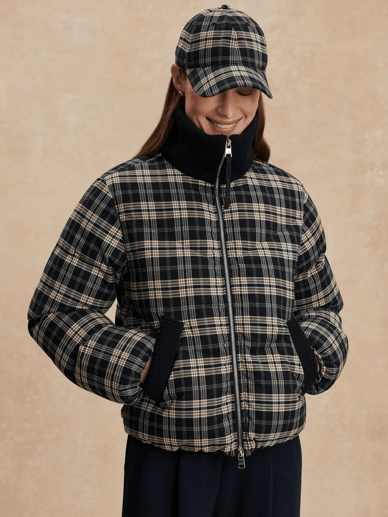 Bryony Short Puffer Jacket in Navy Check