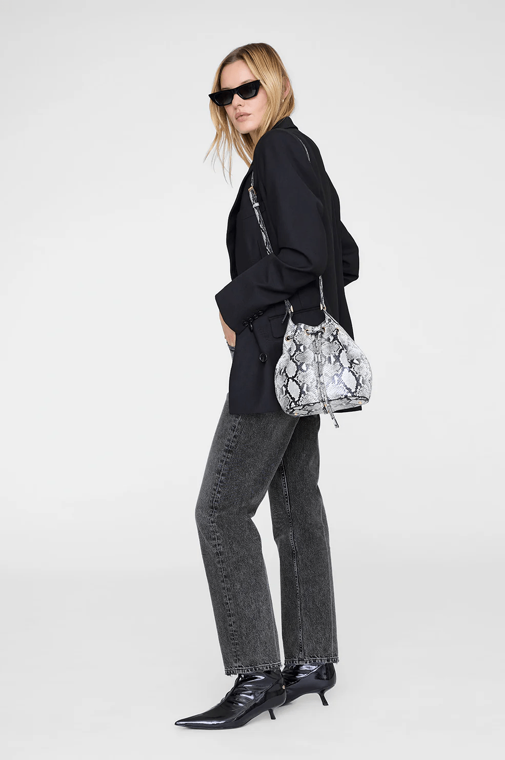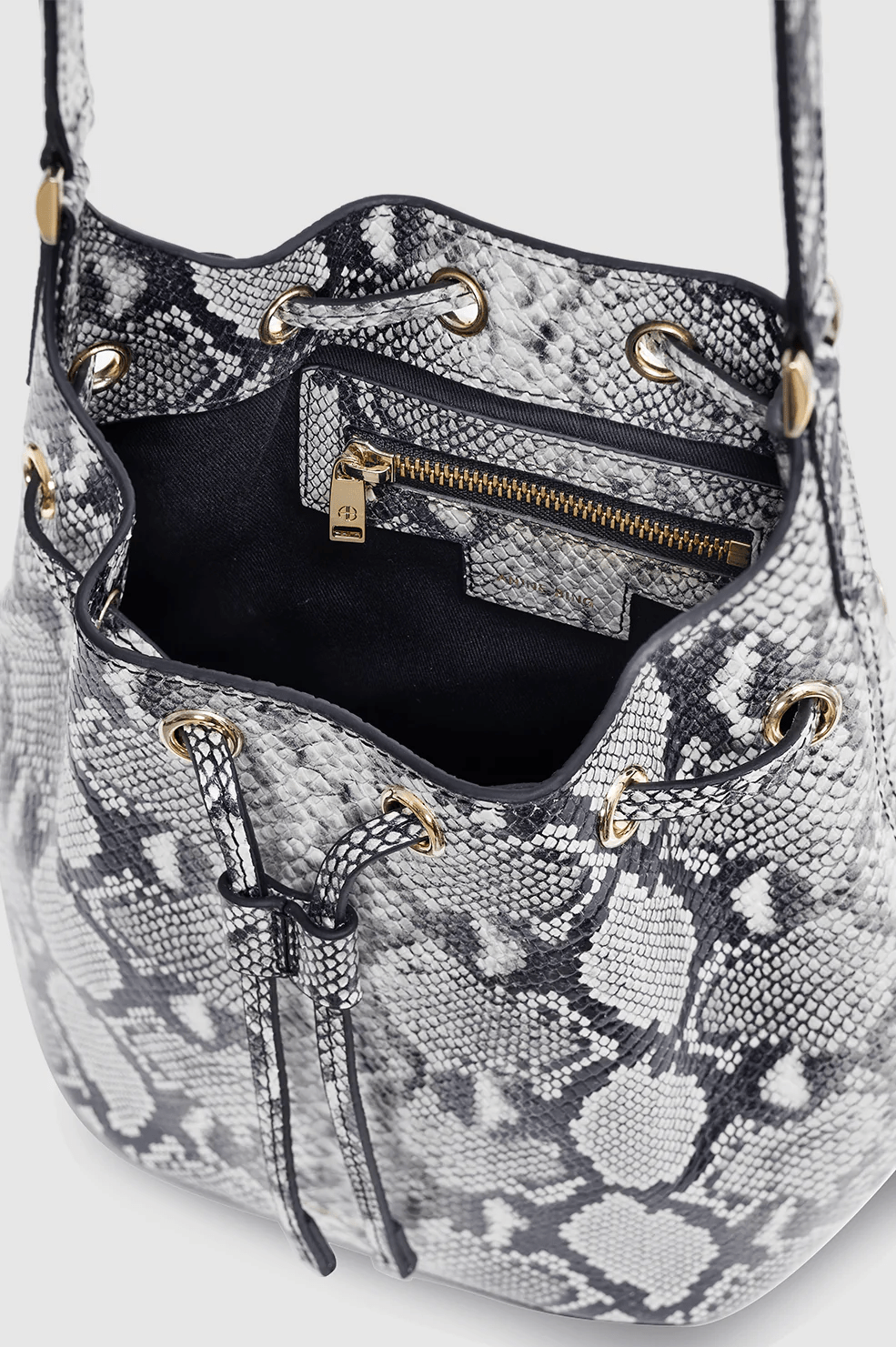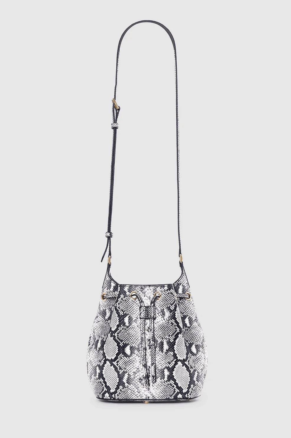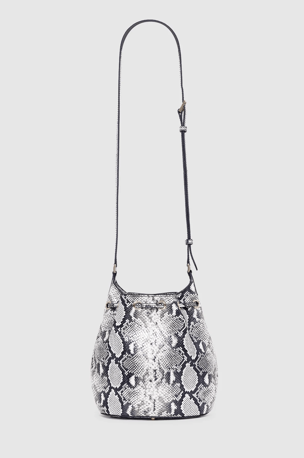 A mini bucket bag crafted from soft-yet-structured 100% leather embossed with a black and white python print.