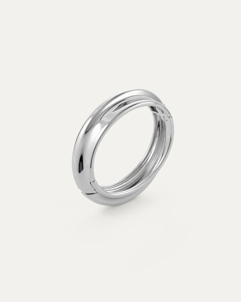 An organically-shaped bangle that boasts deep contours. This custom bracelet opens and closes with a hinge and tab lock closure. To open, push down on the highest point of the clasp before pulling the bracelet open. To close, listen for a "click" to ensure tab is locked properly. Finished in high-polish silver.