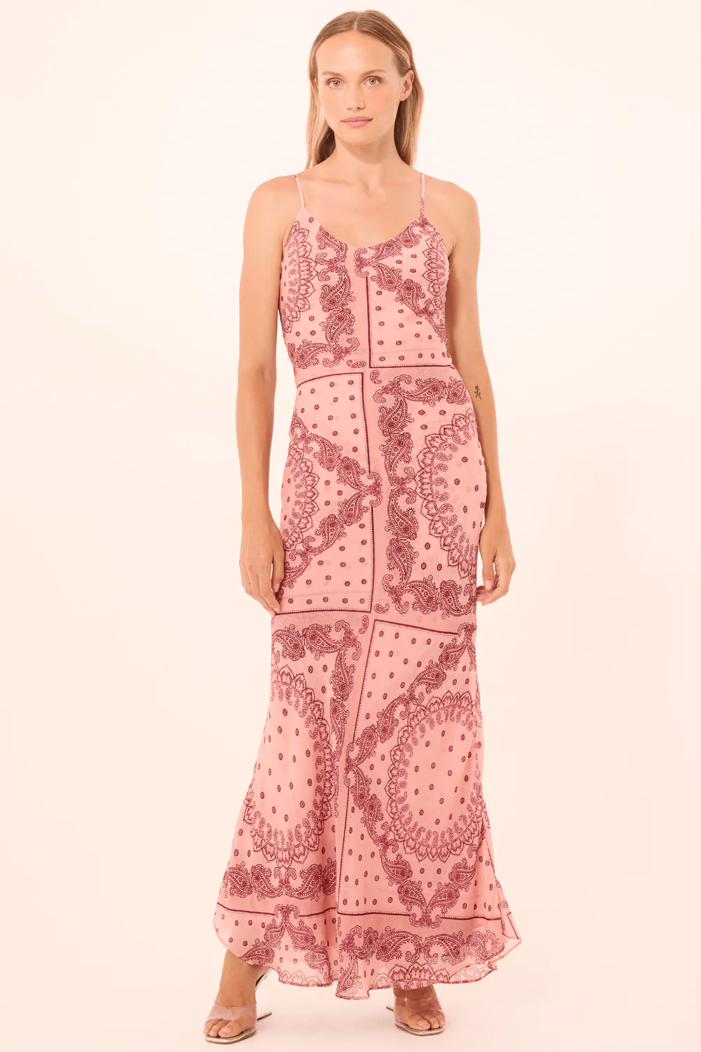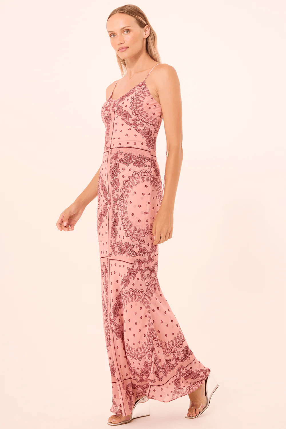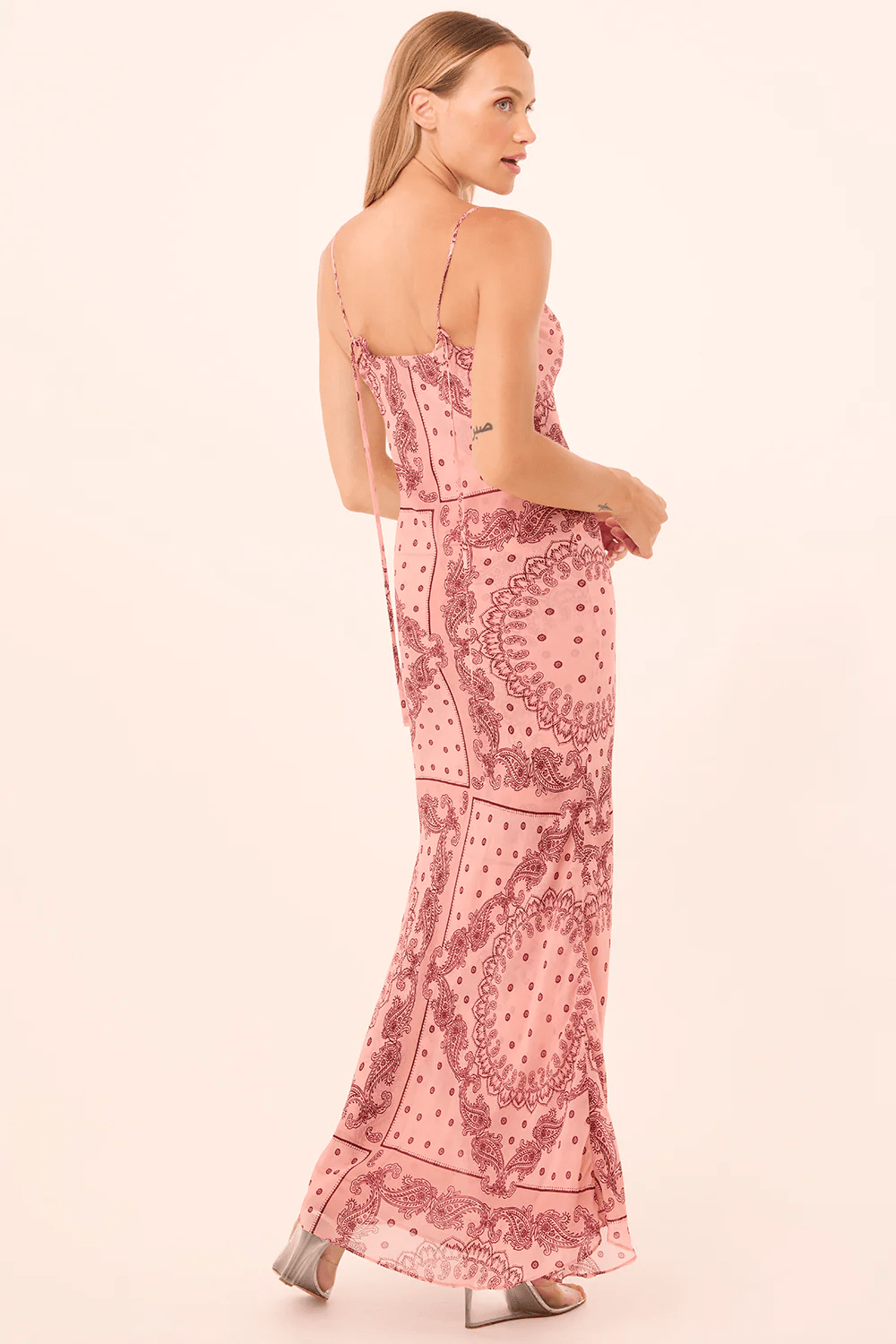 Sariyah is a fitted slip-style maxi dress cut on the bias from our tonal rose bandana print viscose. Designed with delicate spaghetti straps and a curved V-neckline, it features back tie details at the straps for a feminine touch. Fully lined with a slightly curved hem, this timeless silhouette transitions effortlessly from day to night and will be a favorite for seasons to come.