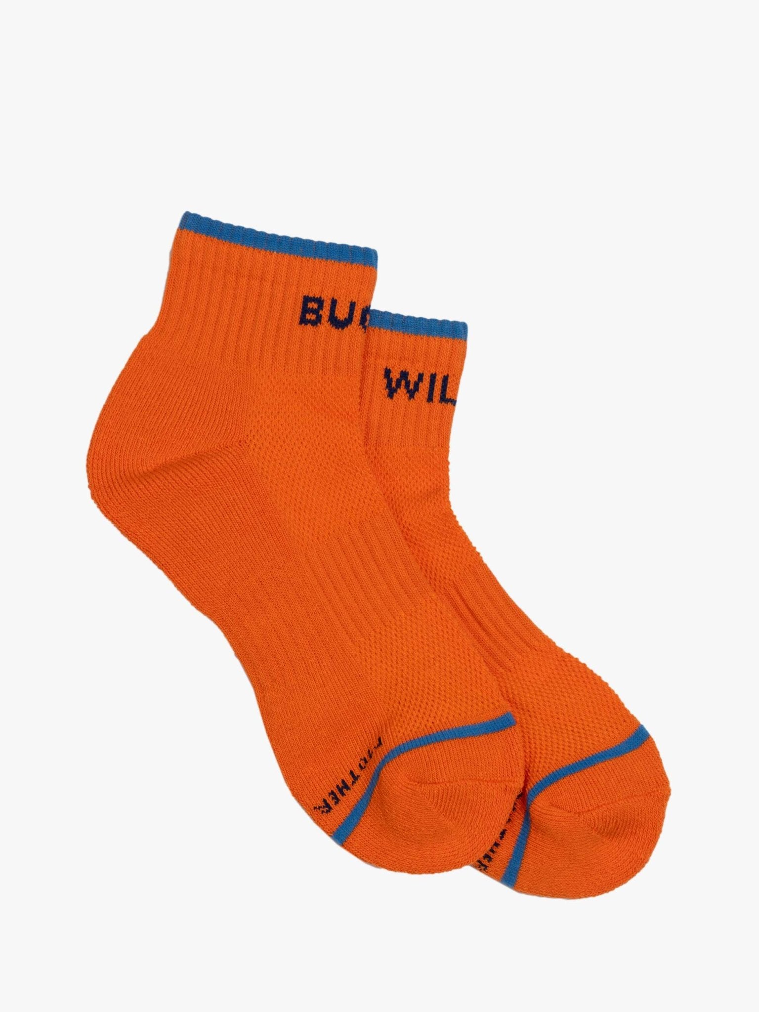 Buck wild. Ankle-length tube socks with a subtle heads up from MOTHER. Shown here in orange with blue text and details.