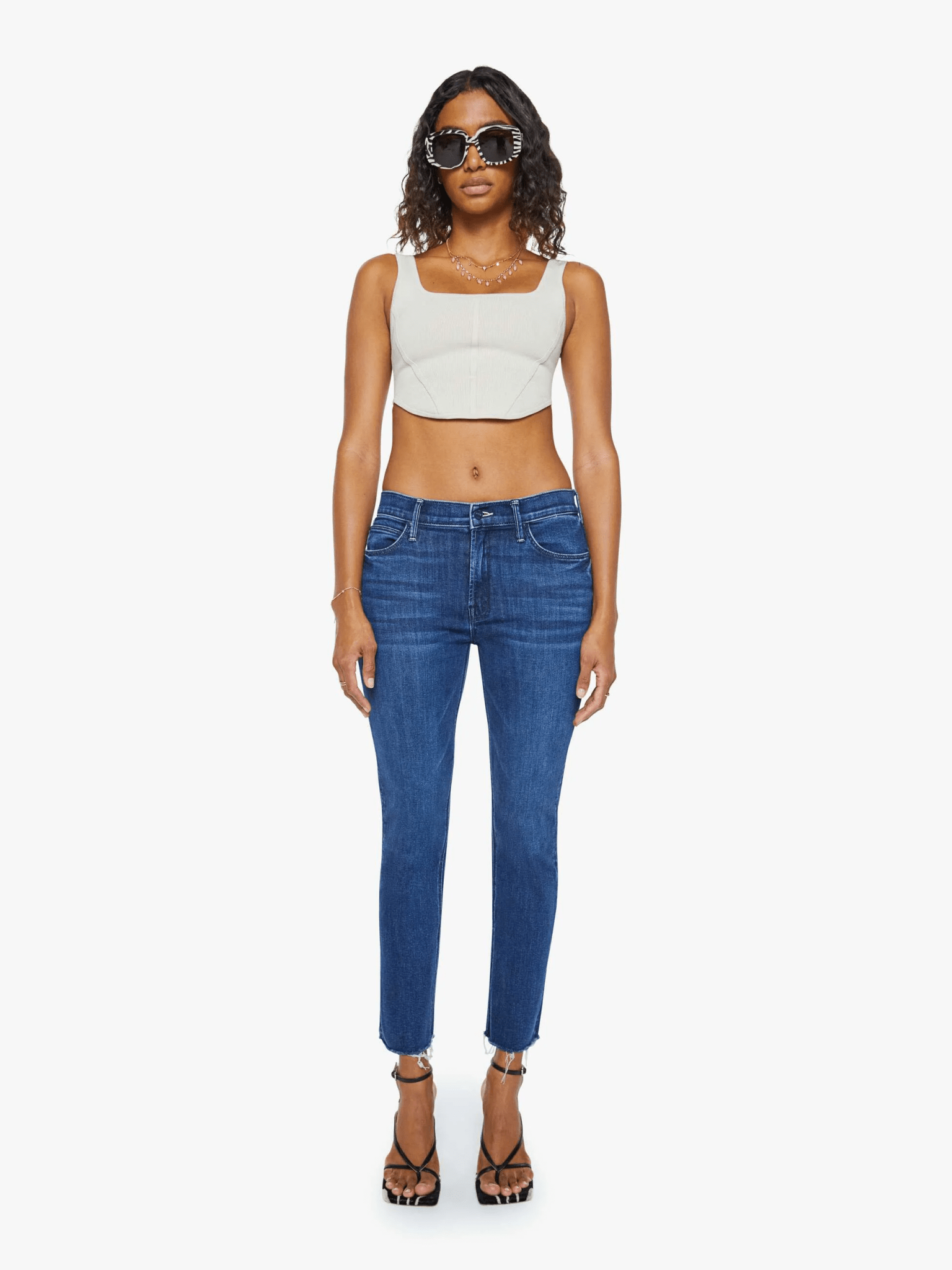 Surprise, surprise. Our most popular mid-rise straight leg hits at the ankle with a frayed hem. Made from stretch denim, Fancy Meeting You Here is dark blue with subtle whiskering and fading at the knees.