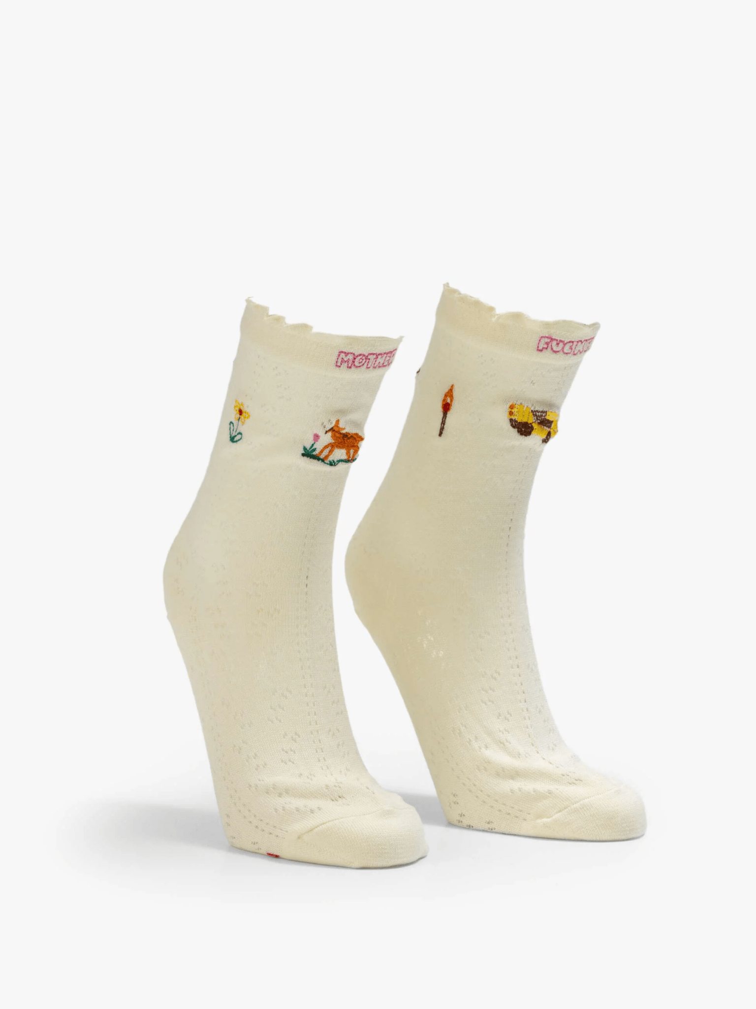 From cab to cabin. Tube socks with a message from MOTHER. Shown here in white with colorful embroidery throughout.