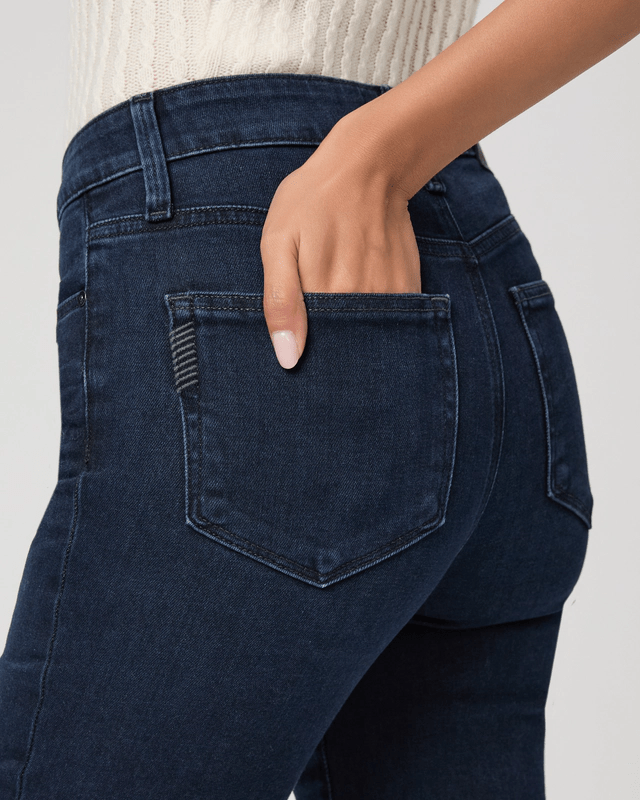 Gemma is our modern update on the classic skinny, with a high-rise slim cigarette leg and an ankle length inseam. Cut from TRANSCEND VINTAGE denim in a super dark blue/black wash with soft, subtle contrasting hardware and a black back patch, this pair combines the signature comfort of Transcend with rich denim character for a lived-in look.