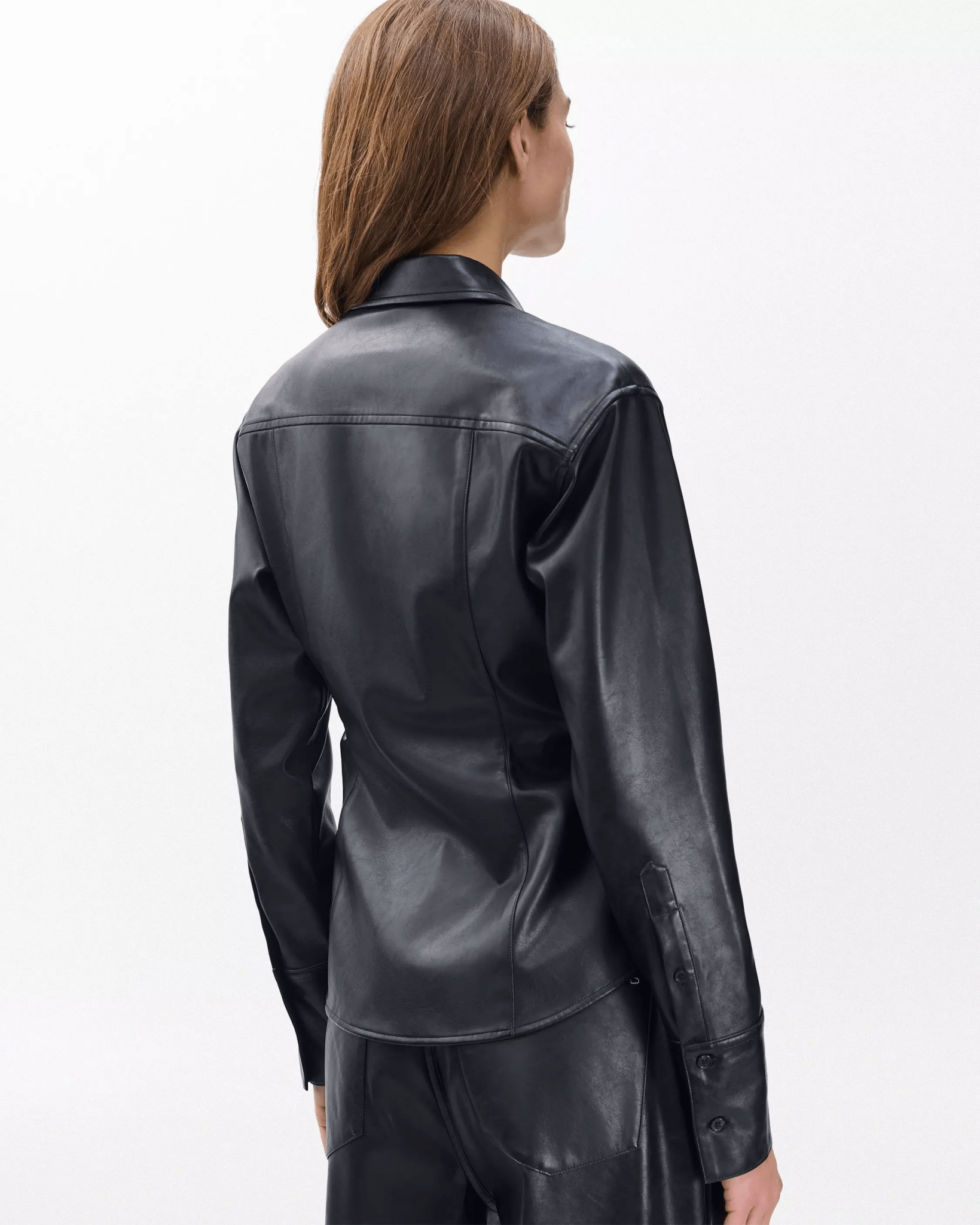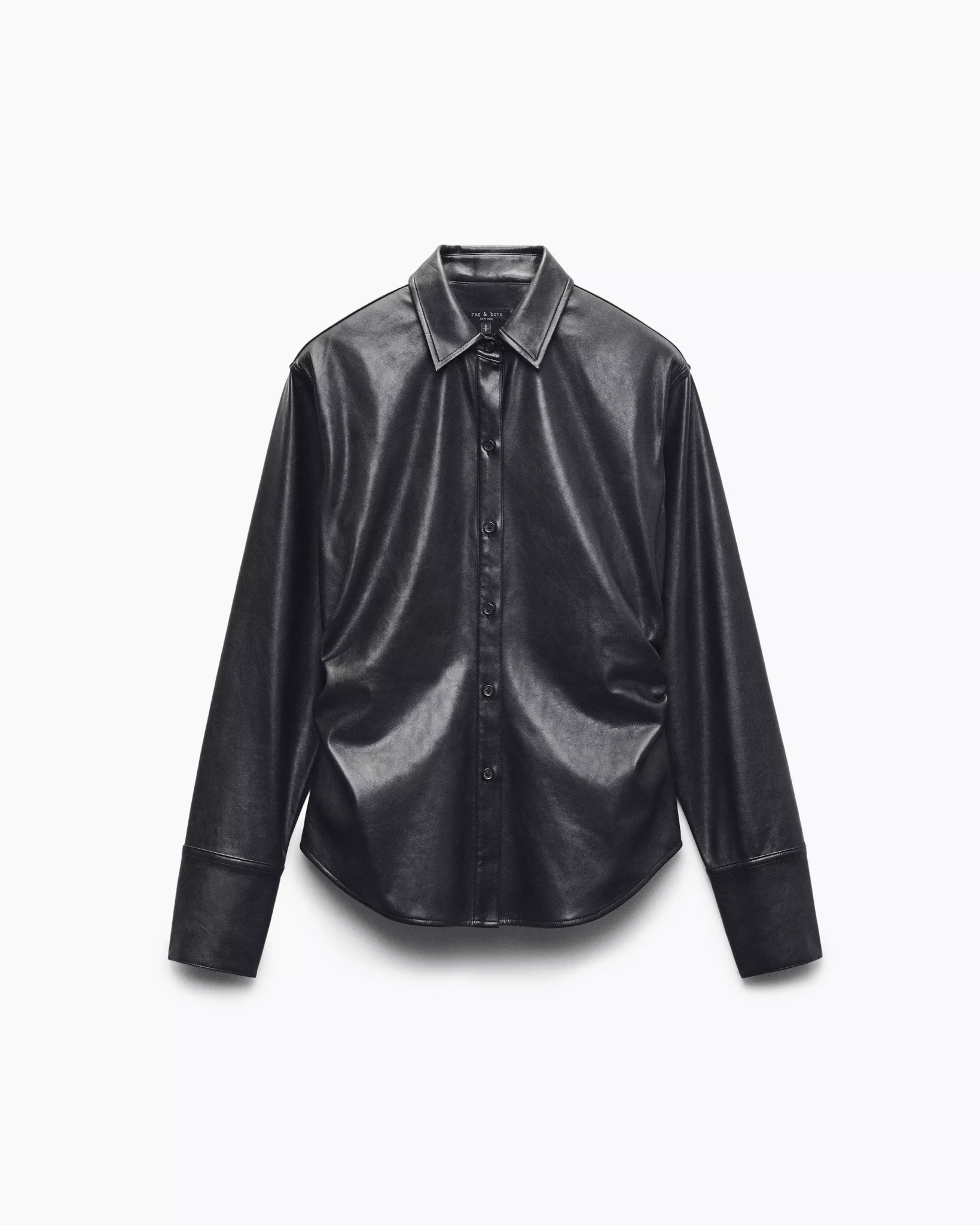 Refined simplicity. Crafted from soft faux leather, this button-down shirt features ruched sides to reinforce its sleek slim fit. With a collar and long cuffs, it brings an edge to a classically tailored style.