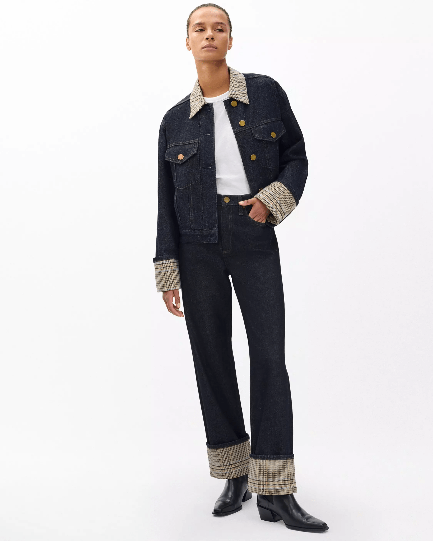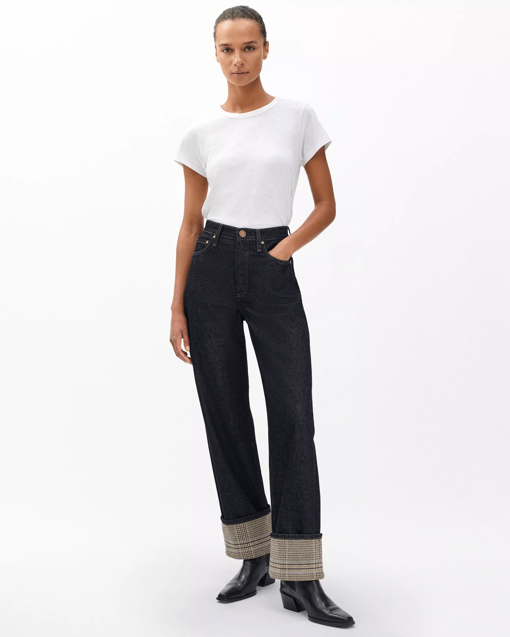 The Shea. High-rise jeans with a fitted waist and a relaxed, straight leg that hits at the ankle. An easy, everyday fit. Crafted from Lightweight Rigid non-stretch denim that provides structure, but breaks in over time for a soft and comfortable feel. In Twilight Combo, an inky dark wash with a sewn-down 4" cuff trimmed at the face with an Italian-milled heritage wool plaid.