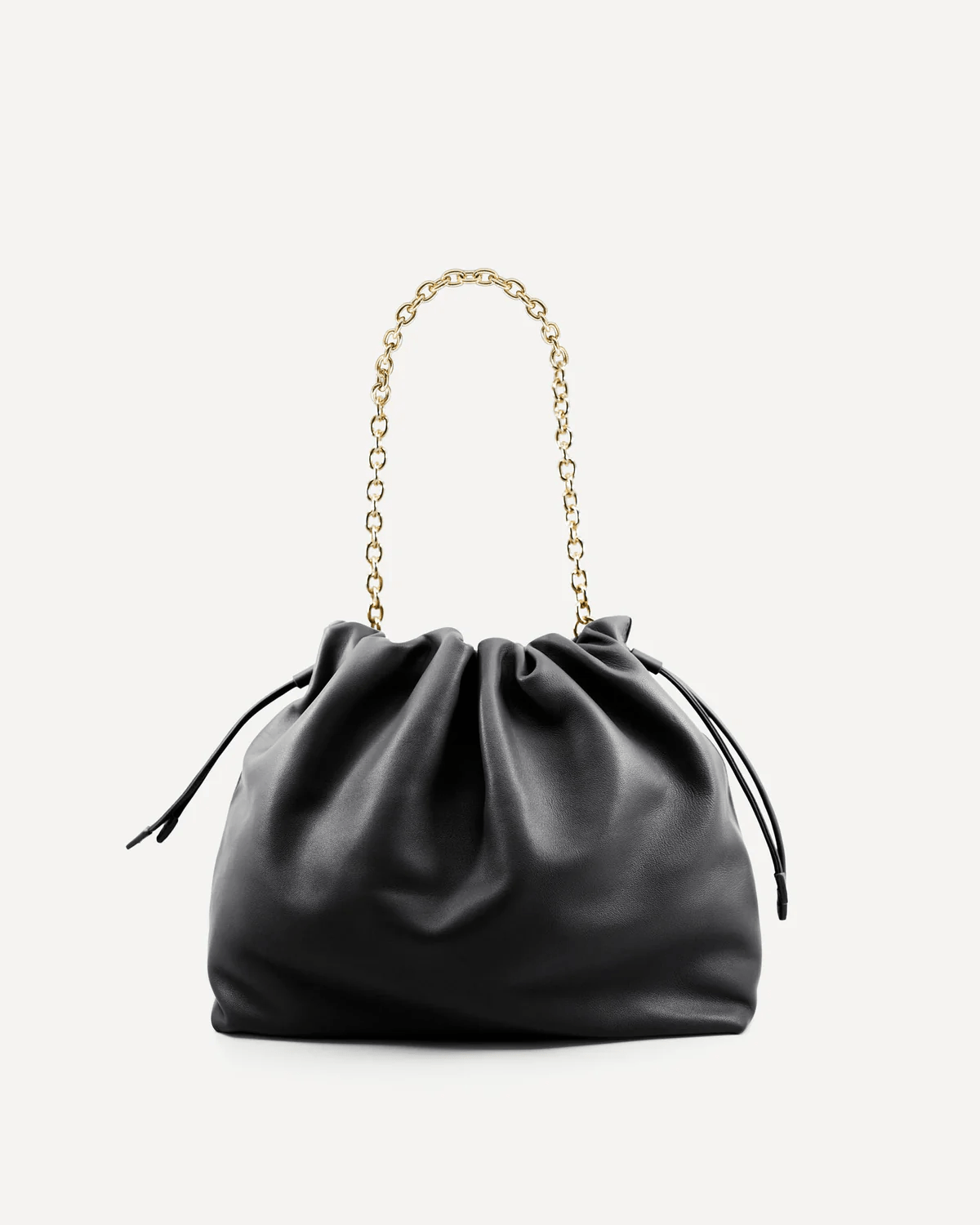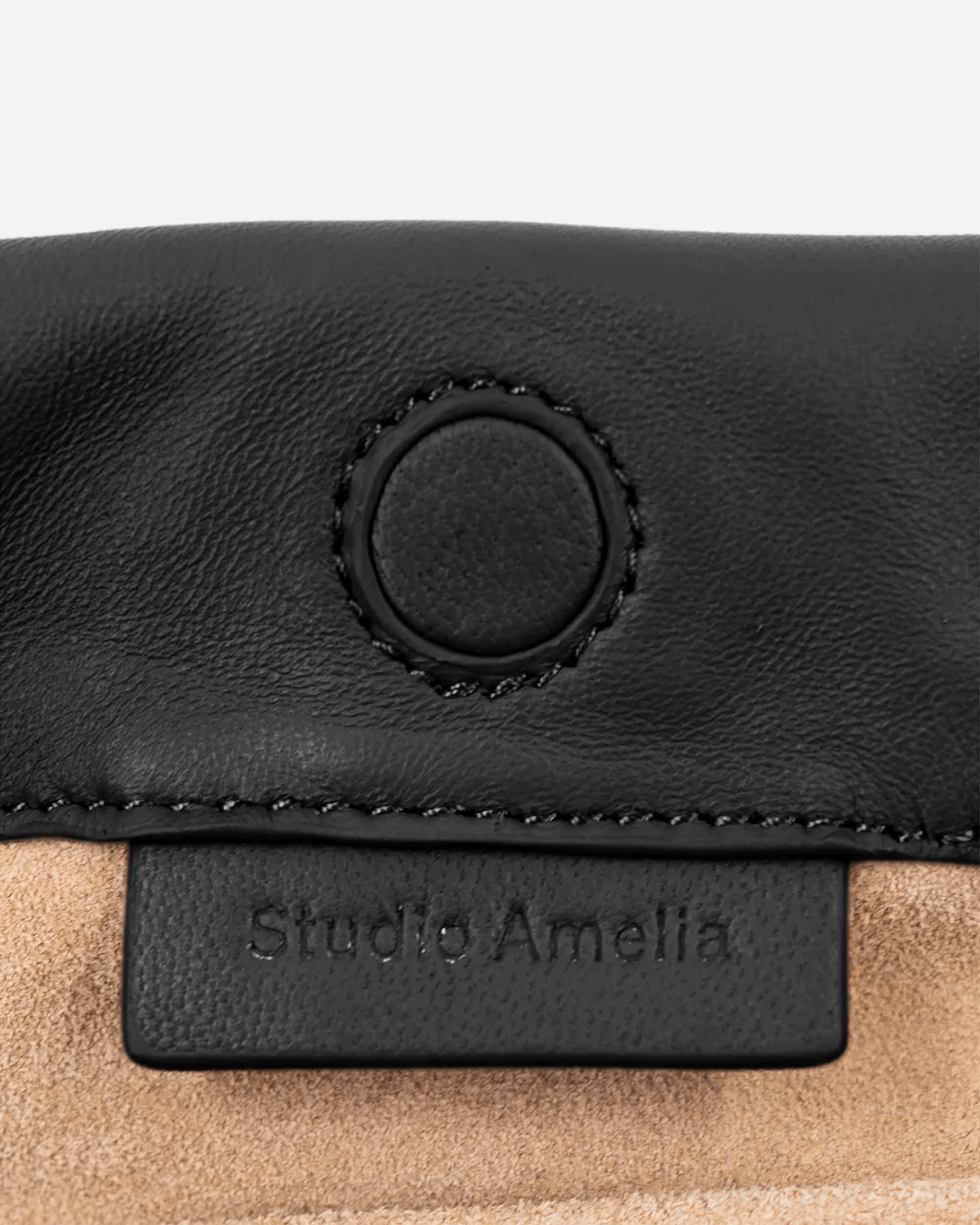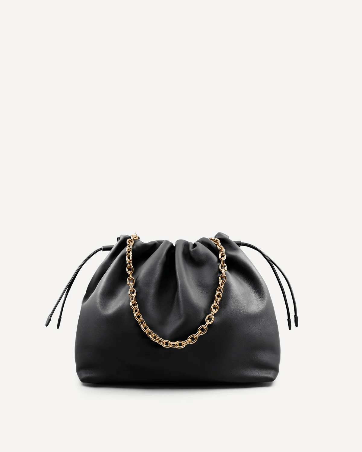 The Alexandra Drawstring Clutch is made from 100% Chrome-Free Sheep Nappa Leather with a luxuriously soft suede lining. This style features a ruched drawstring closure with statement arrow ends, an additional magnetic closure, an internal card pocket, a removable crossbody strap with custom Studio Amelia lobster clasps and a statement gold plated circular chain handle.