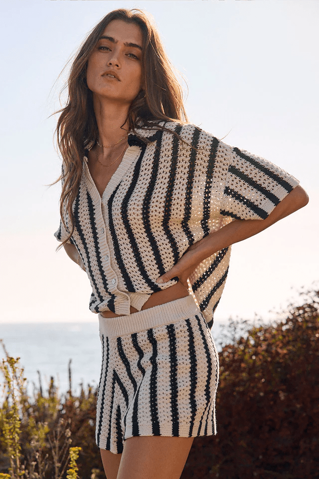 Inspired by the glamour of the 60s, these flowy shorts feature wide black and white stripes and a low waistline with a white waistband.