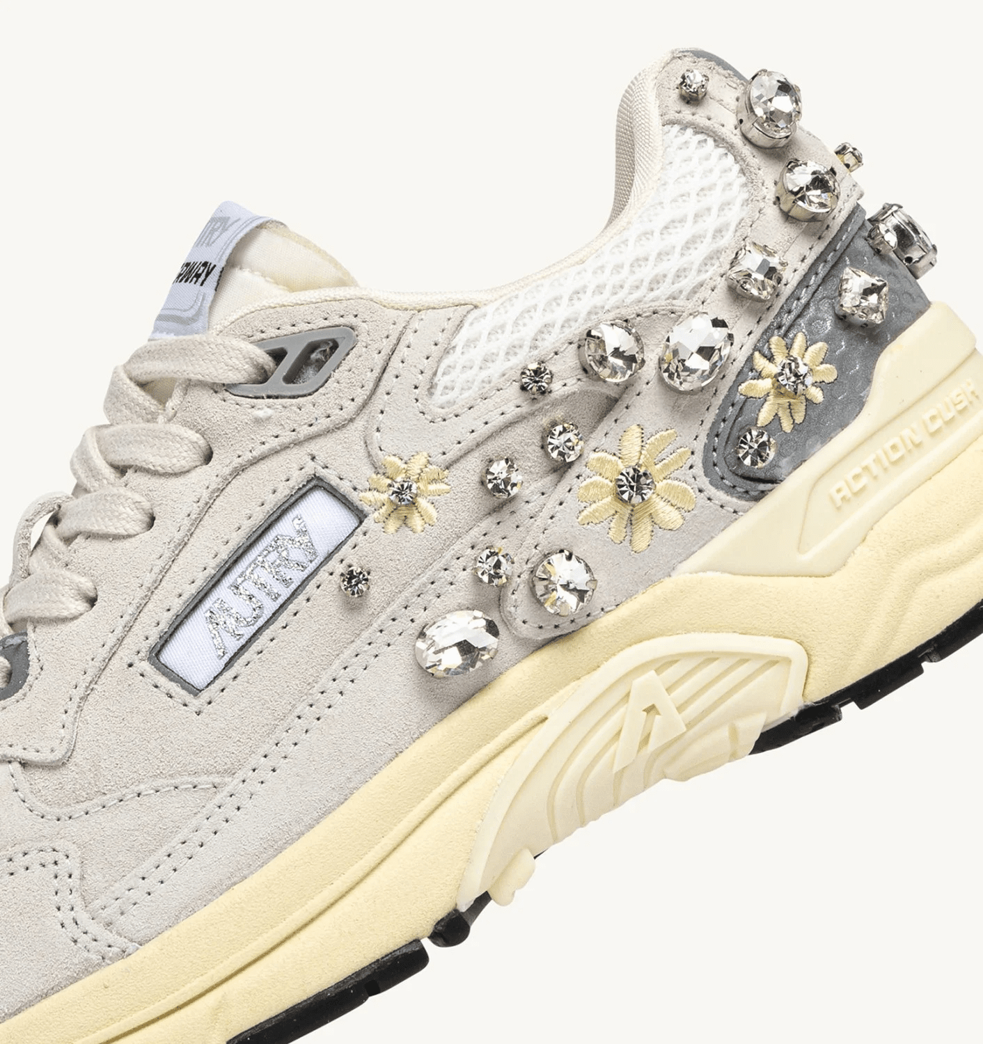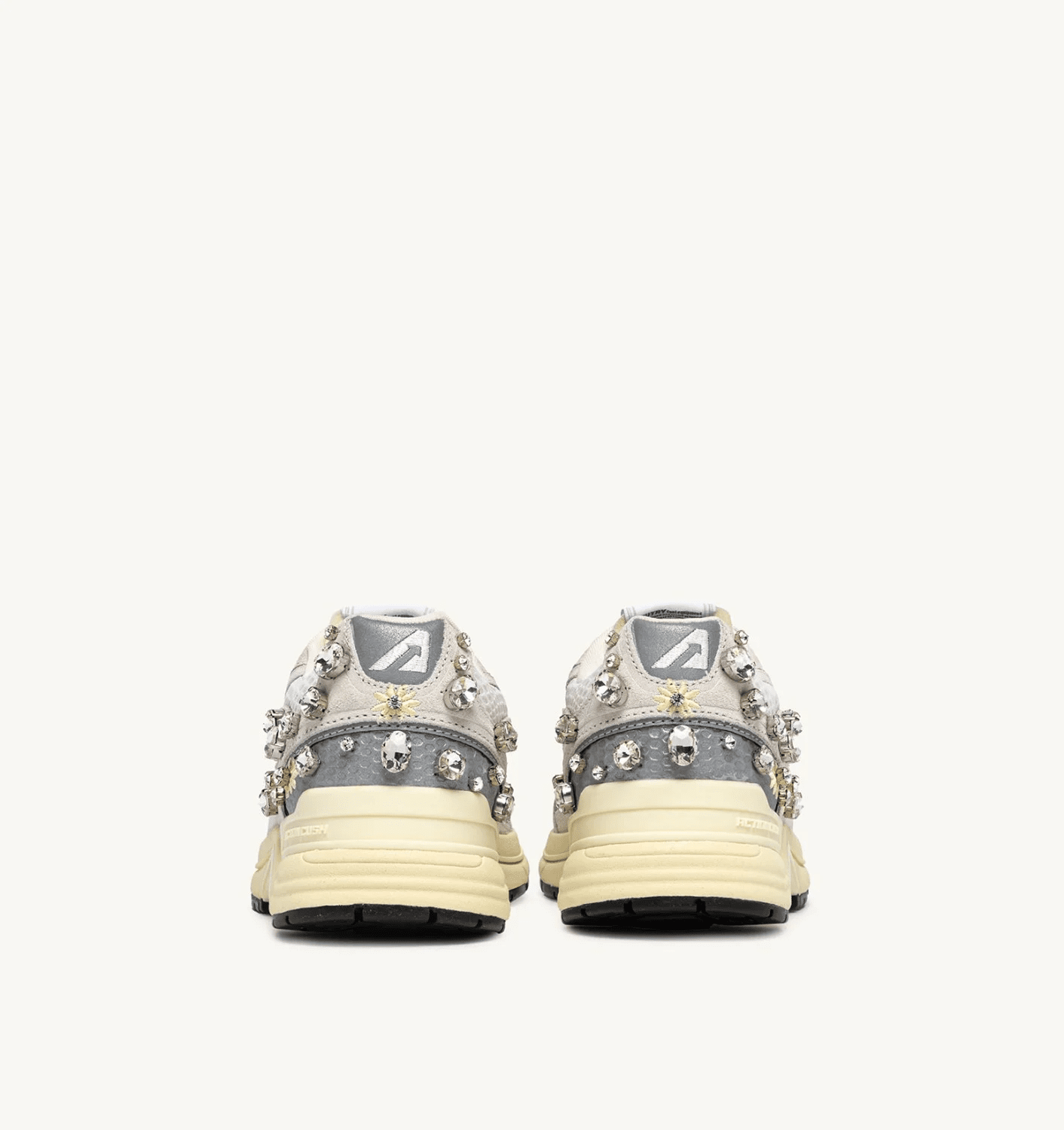 The nylon tongue for a functional and refined design, the label on the tongue, and the side logo, both in jacquard fabric, provide an extra touch of authenticity. This style stands out for its floral embroidery and rhinestone applications on the heel, which give the shoe a distinctive character, reinterpreted with a unique contemporary appeal.