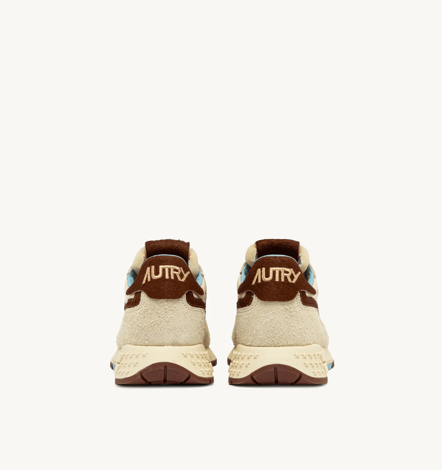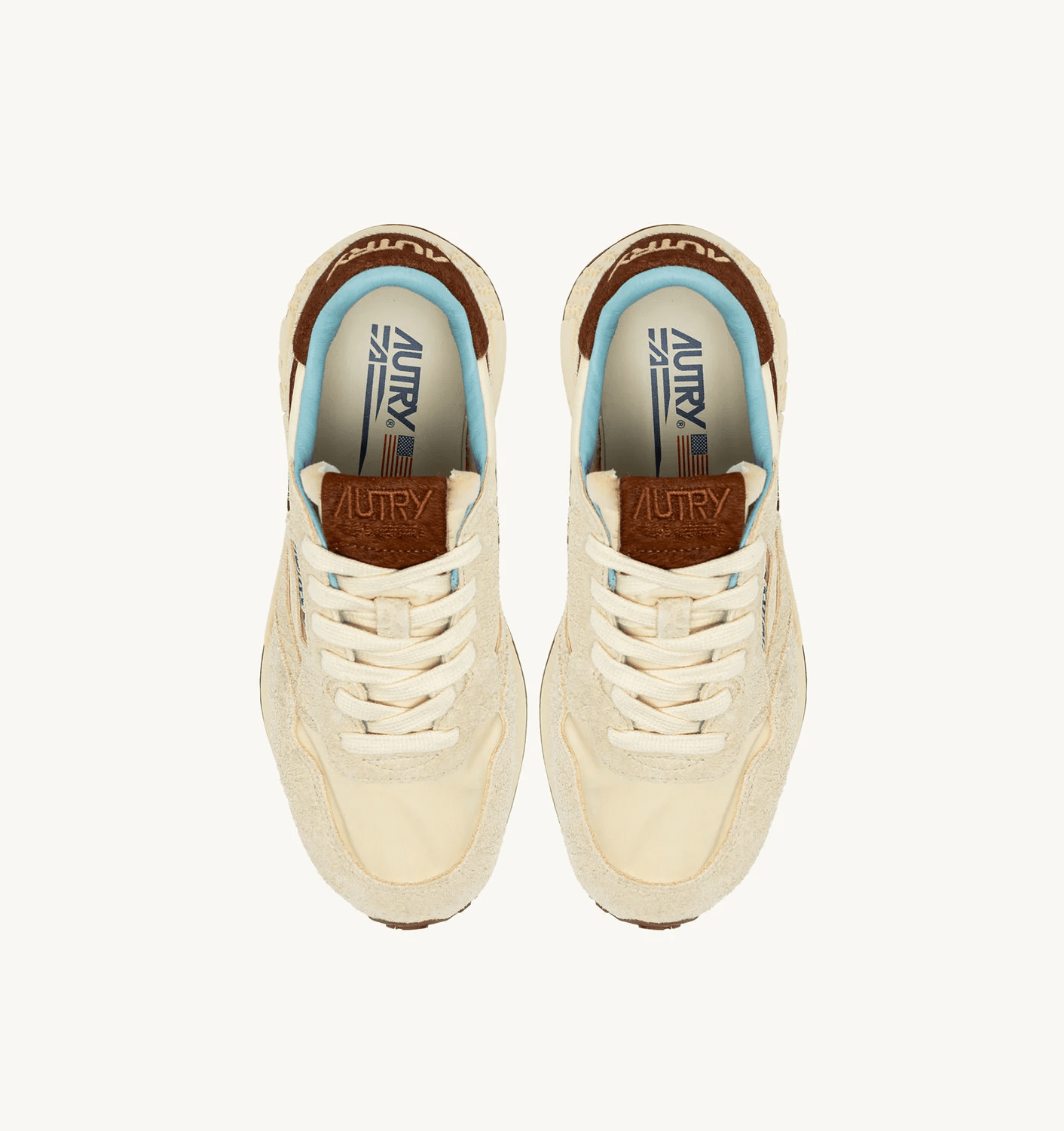 Reelwind sneakers blend Autry’s signature style with elements inspired by the world of running. Featuring a sleek silhouette and an ’80s-inspired retro design, they offer lightness, flexibility, and optimal grip. The women’s version is made from beige suede and nylon with brown pony skin-effect side inserts