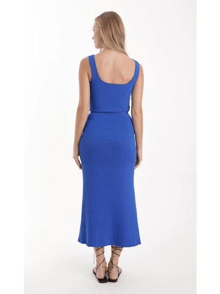 Meet the Karina Grimaldi Ciara Knit Set. The Ciara Knit Set in royal blue includes a sleeveless top and a matching skirt with a front slit and slim belt. The ribbed knit gives it a modern look, while the two-piece design is both comfortable and stylish for any event.