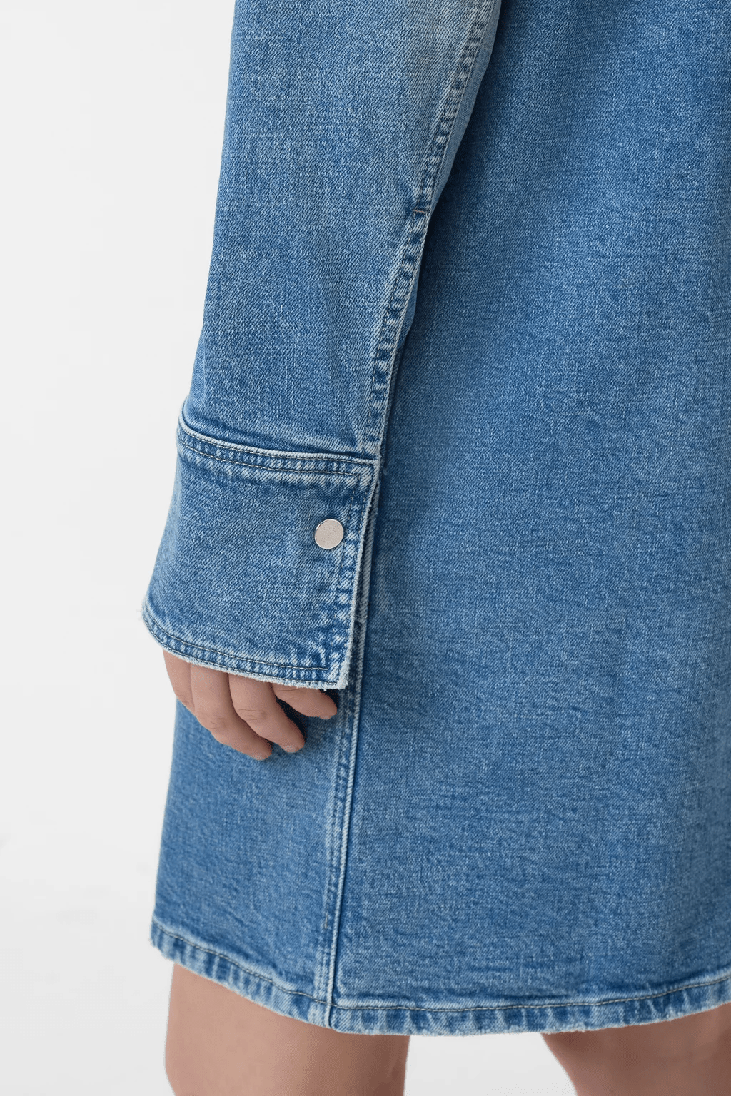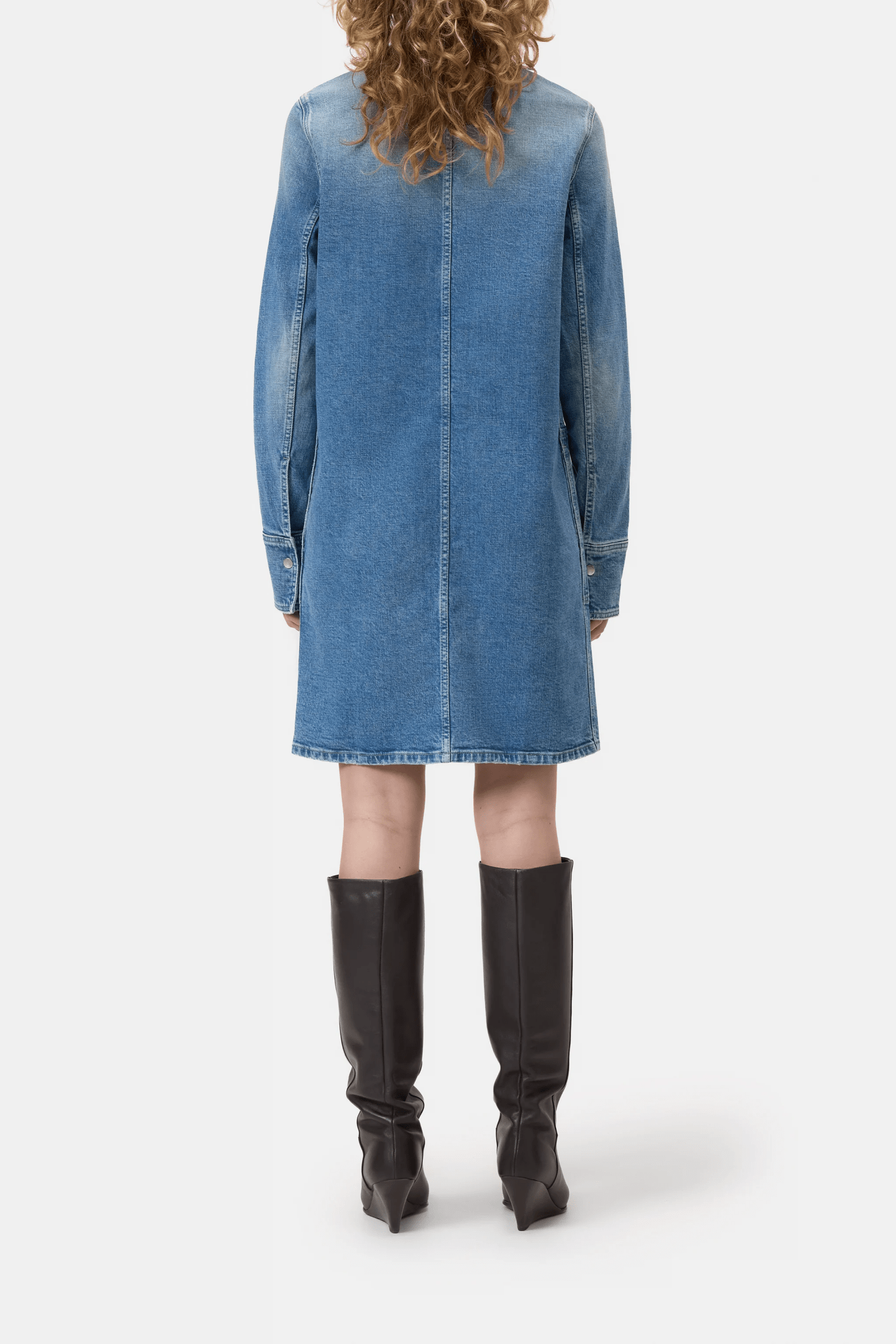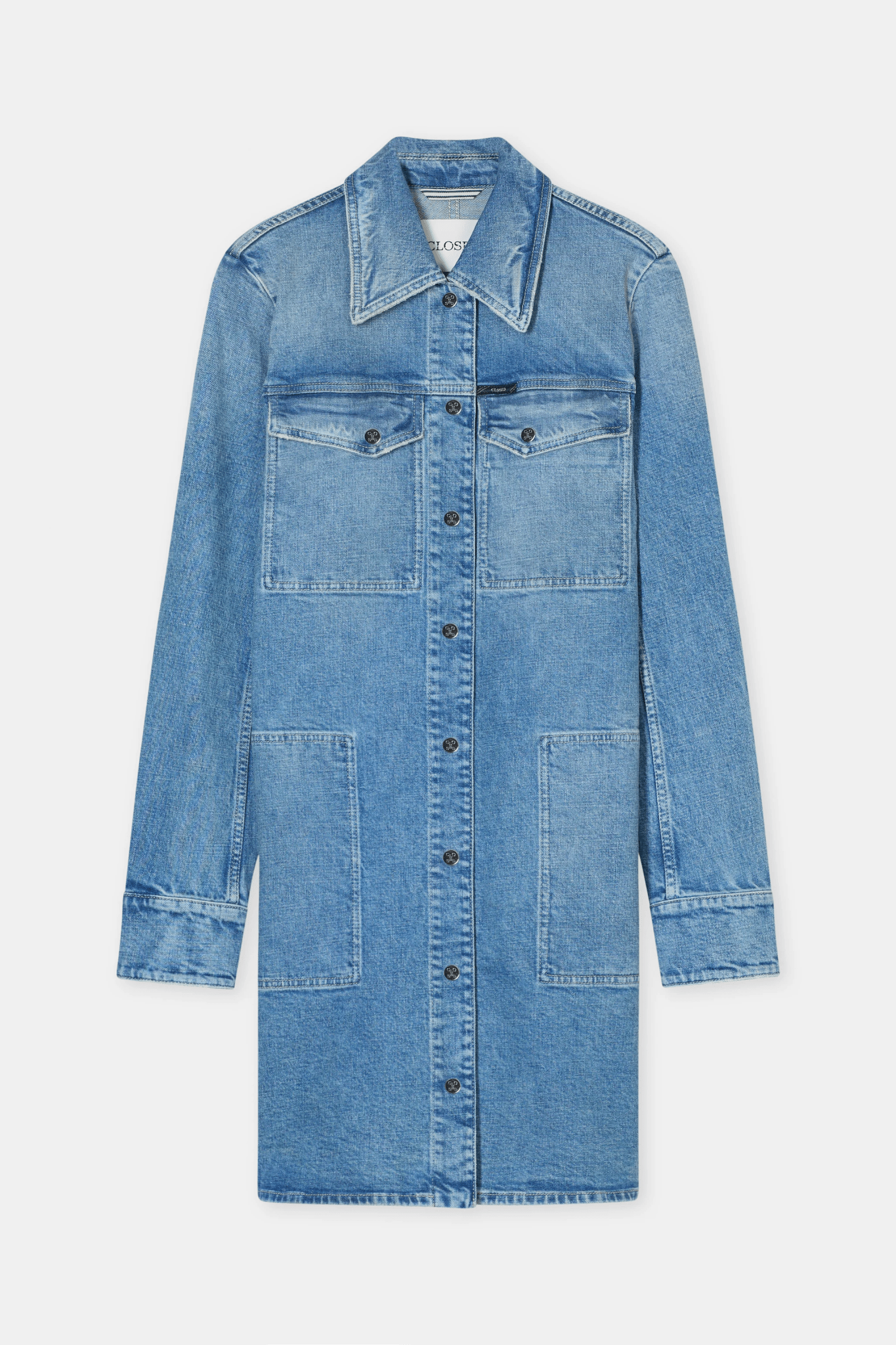 This dress is made from high-quality denim with a light crosshatch texture and a bright blue vintage wash with beautiful high-low effects. It features large utility-style pockets at chest and hip height, as well as metal press studs with a logo monogram. Made in Italy.