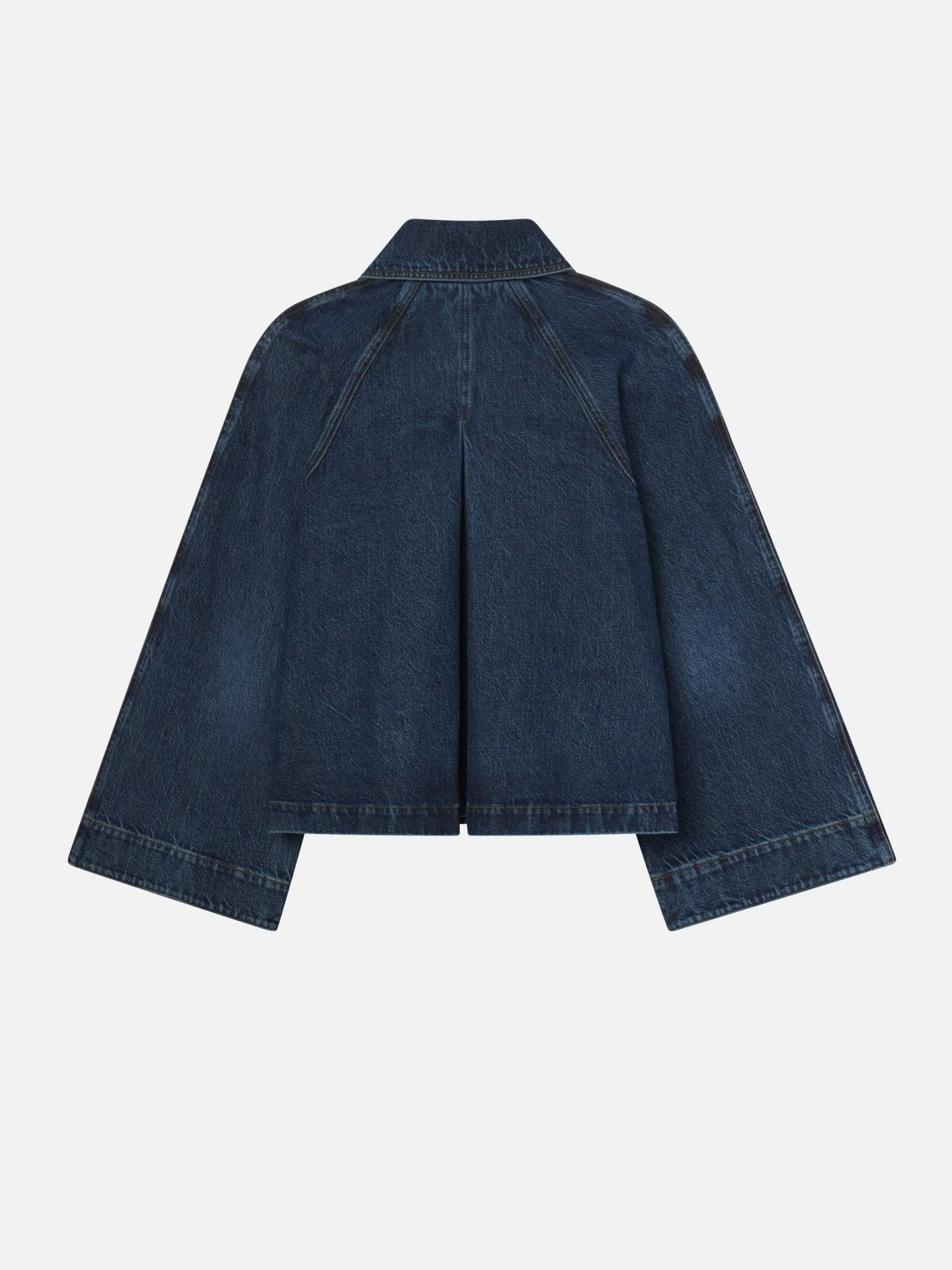 A modern silhouette with a nod to vintage ease. The Swing Jacket is cut in soft denim with a crisp collar, oversized sleeves, and gently flared shape that moves with you. Finished with patch pockets and a rich, indigo wash—designed to layer effortlessly, just like your favorite jeans.